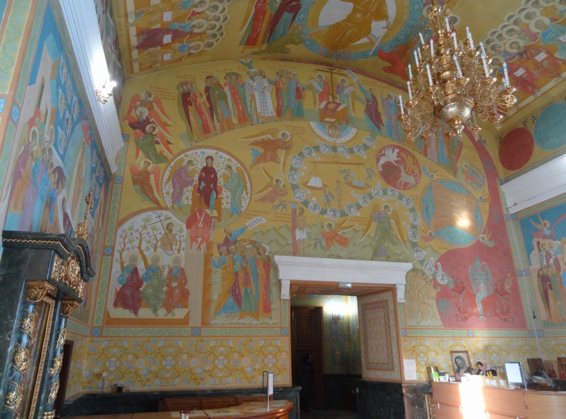 Интерьер дополняет массивная золотистая люстра с множеством свечей, свисающая в верхней правой части пространства. Слева виден богато украшенный позолоченный киот (или часть иконостаса). В нижней части фотографии находятся деревянные элементы убранства — кафедра или аналогичная церковная утварь. Дверной проём с белым обрамлением ведёт в соседнее помещение.