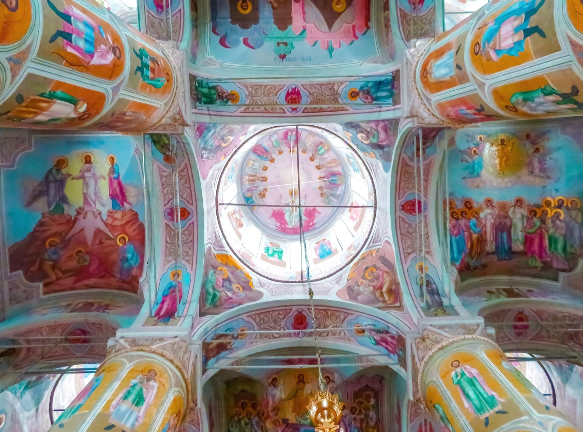 Священные стены и своды храма украшены многочисленными фресковыми росписями, выполненными в канонических традициях православной иконографии. На фотографии хорошо просматриваются библейские сцены и образы святых угодников, которые создают особую молитвенную атмосферу. В центральной части собора возвышается световой барабан, прорезанный арочными окнами, через которые в храм проникают потоки божественного света.