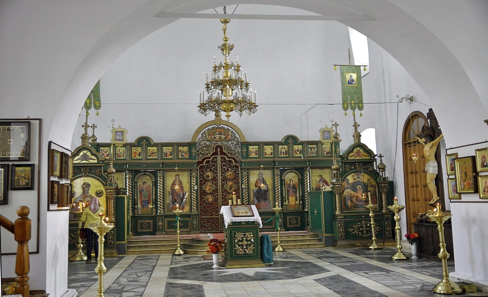 Освещение храмового пространства обеспечивает массивное паникадило, традиционная церковная люстра, свисающая с центрального свода. Его золотистое сияние символизирует Небесный свет и создаёт молитвенную атмосферу.