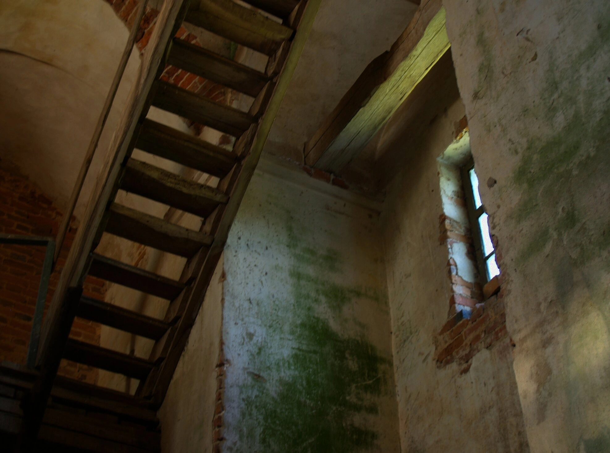В левой части кадра видна деревянная лестница, ведущая на ярус звона колокольни. Её ступени и перила, сохранившиеся вопреки времени и невзгодам, говорят о мастерстве древних зодчих. Свет, проникающий через высокий арочный оконный проём в правой части изображения, освещает массивные стены из красного кирпича, местами утратившие свой штукатурный слой.