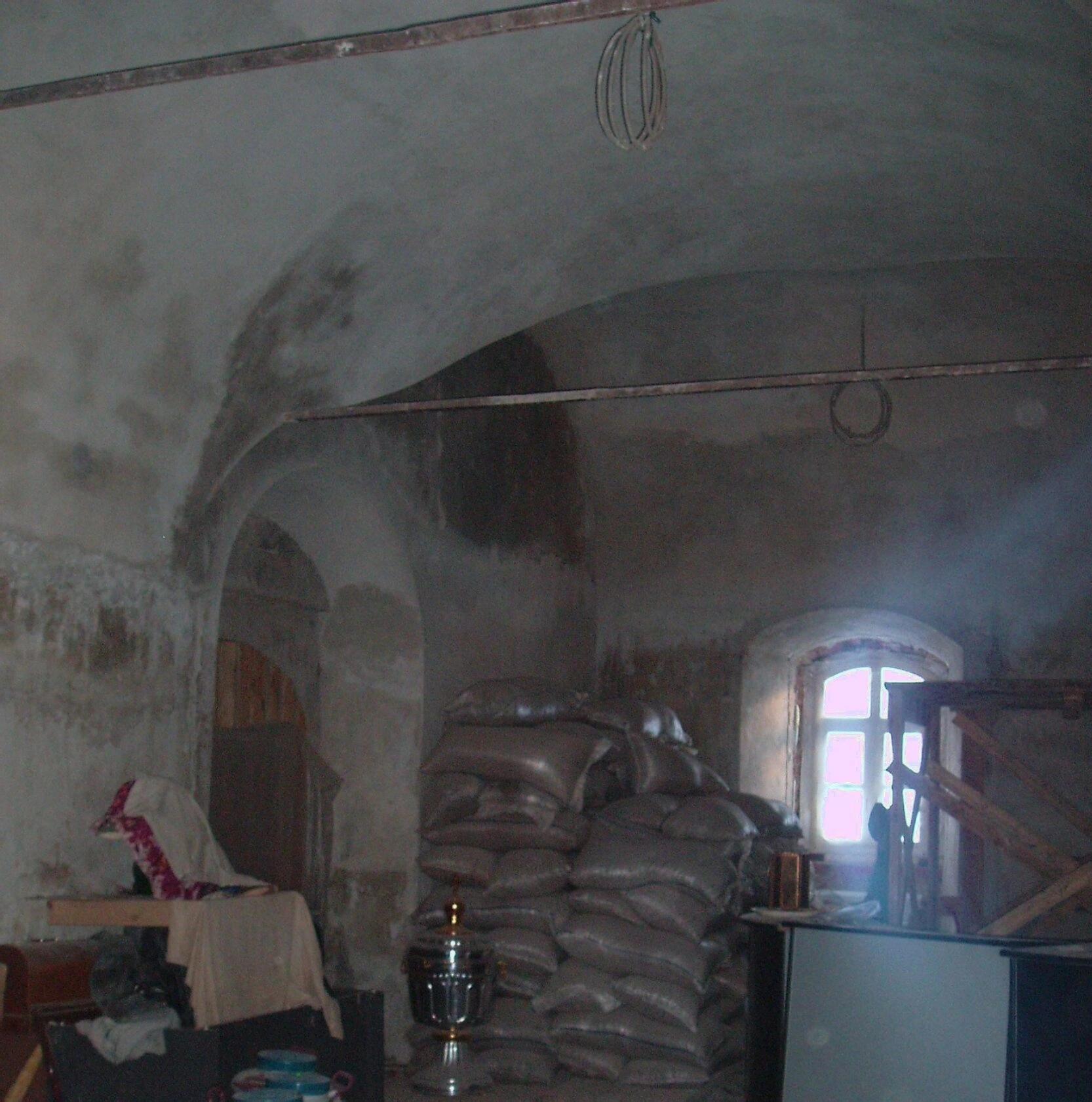 На снимке отчетливо просматривается сводчатое завершение помещения, характерное для церковной архитектуры. Состояние интерьера свидетельствует о необходимости проведения реставрационных работ, однако даже в настоящем виде пространство сохраняет особую атмосферу духовности и благоговения.