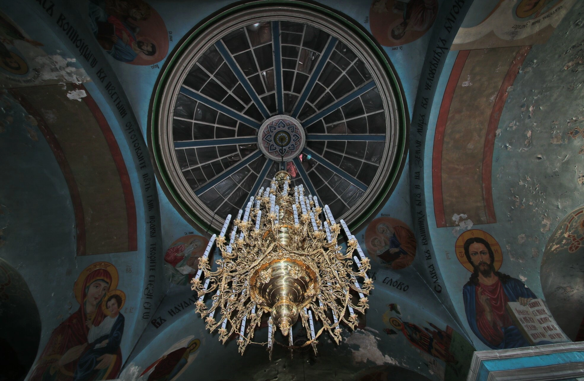В центре композиции находится массивная храмовая люстра, традиционно называемая паникадилом. Это сложное многоярусное сооружение, предназначенное для освещения пространства под главным куполом. Паникадило украшено многочисленными светильниками, символизирующими небесные силы и горний мир, и выполняет не только utilitarianную, но и глубокую духовную функцию, напоминая верующим о свете Божественной истины.