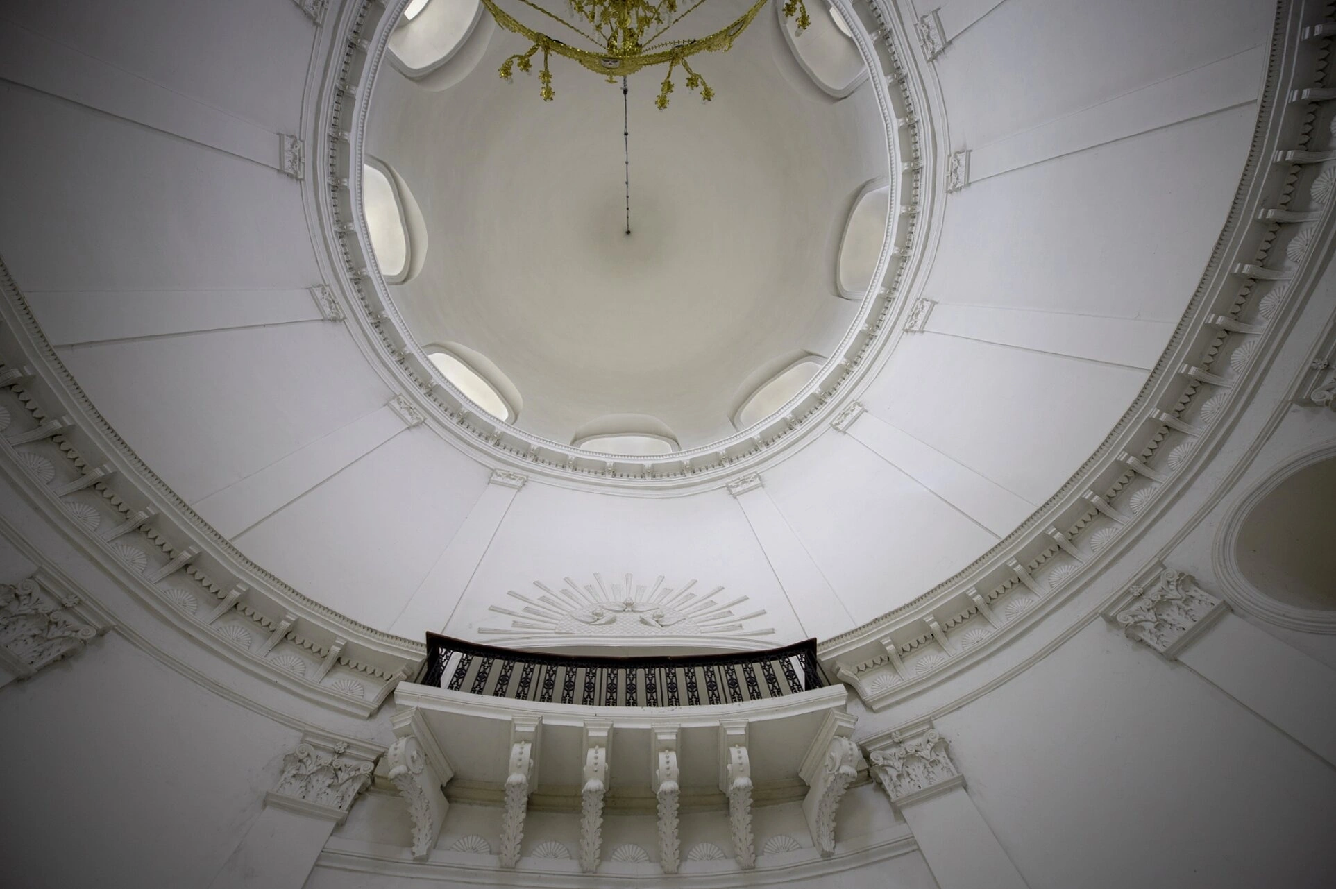В самом центре купола свисает массивная многоярусная люстра, традиционно называемая паникадилом. Его сложная форма и множество светильников призваны освещать молитвенное пространство храма, особенно во время торжественных богослужений. Своды, стены и арки богато украшены лепным декором в классическом стиле: геометрические орнаменты, растительные гирлянды и другие элементы, подчёркивающие благолепие дома Божия.