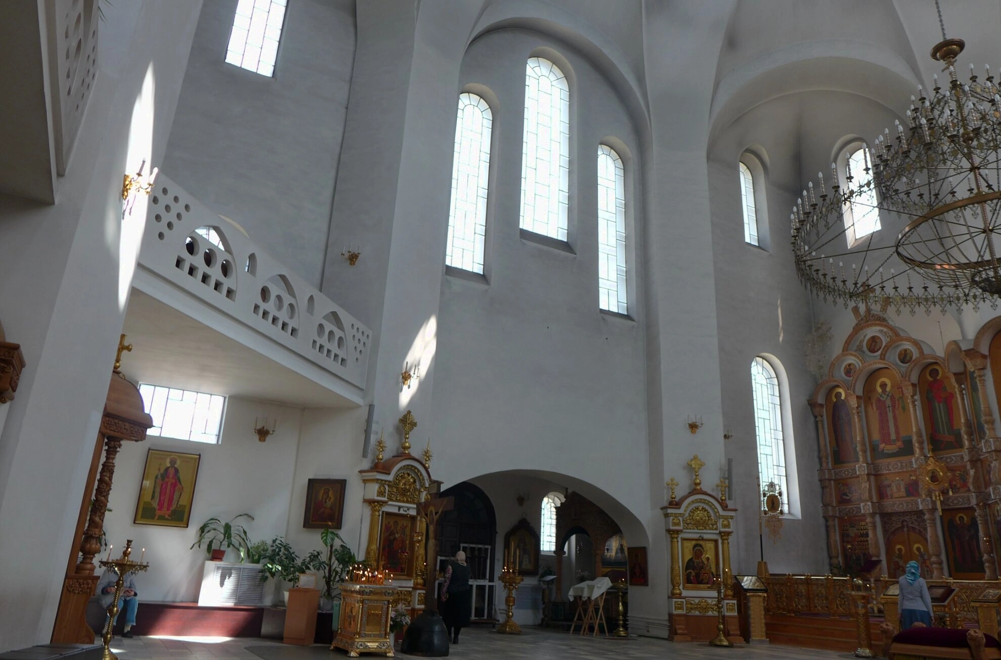 Пространство храма освещено естественным светом, льющемся через высокие арочные окна, и мягким свечением церковных светильников. Взгляд устремляется ввысь, к белосводчатым потолкам, создающим ощущение небесной легкости и простора. Мощные колонны и арки, выполненные в традициях русской церковной архитектуры, подчёркивают монументальность и величие сооружения.