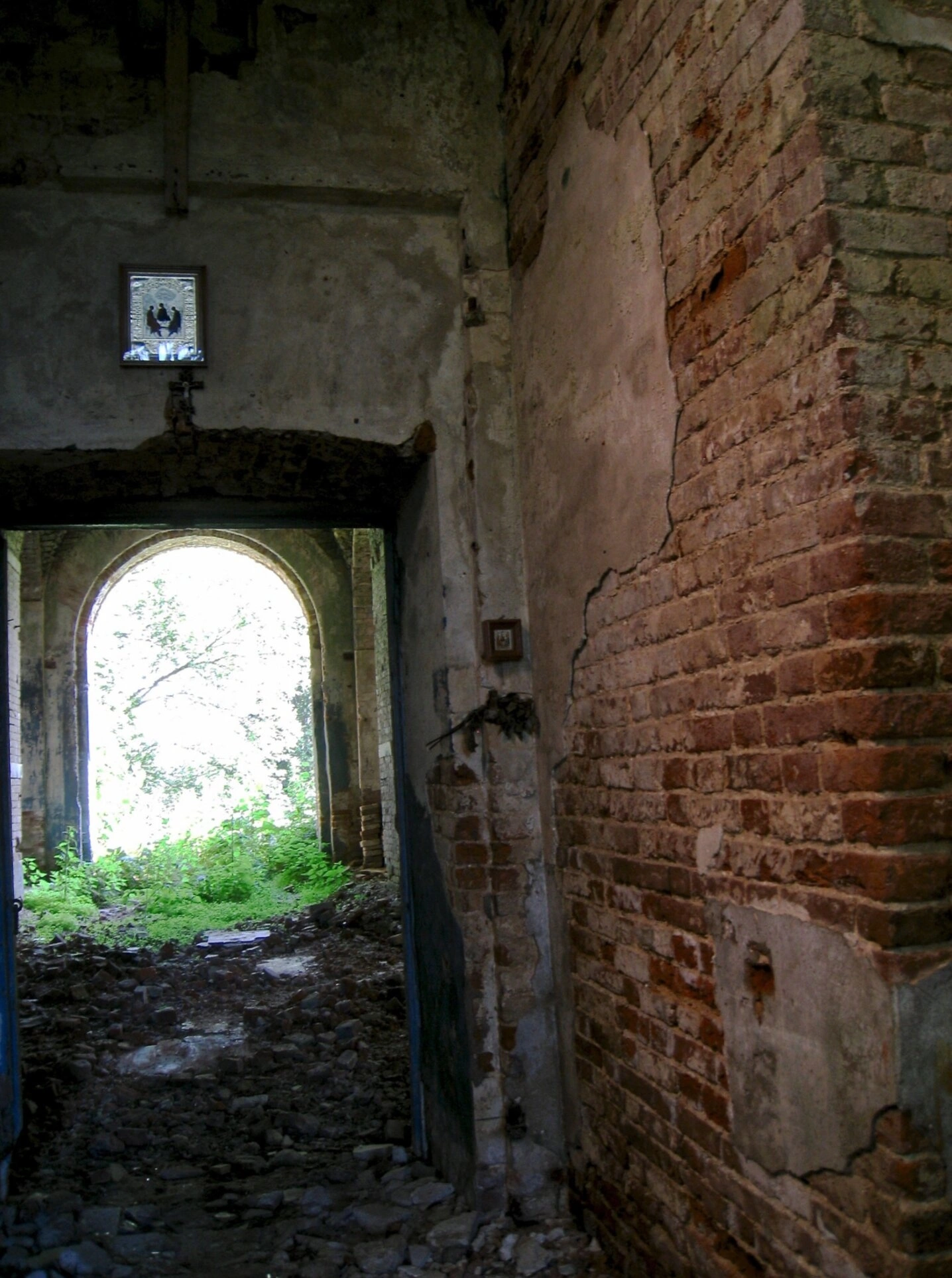 В правой части снимка видна кирпичная стена с многочисленными повреждениями — осыпавшаяся штукатурка обнажает кладку, а глубокие трещины говорят о длительном отсутствии реставрационных работ. Центральным элементом композиции служит арочный дверной проем, ведущий в смежное помещение храма. Архитектурная форма арки характерна для традиционного церковного зодчества.