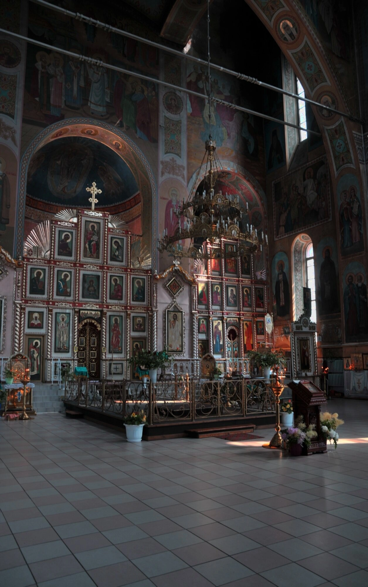 Центральное место на снимке занимает великолепный многоярусный иконостас, богато украшенный резьбой и золочением. В его киотах размещены чтимые храмовые образы, написанные в традициях византийской иконописи и облачённые в драгоценные оклады. Иконостас представляет собой не только духовный центр храма, но и высокохудожественное произведение, воплощающее каноны православного искусства.