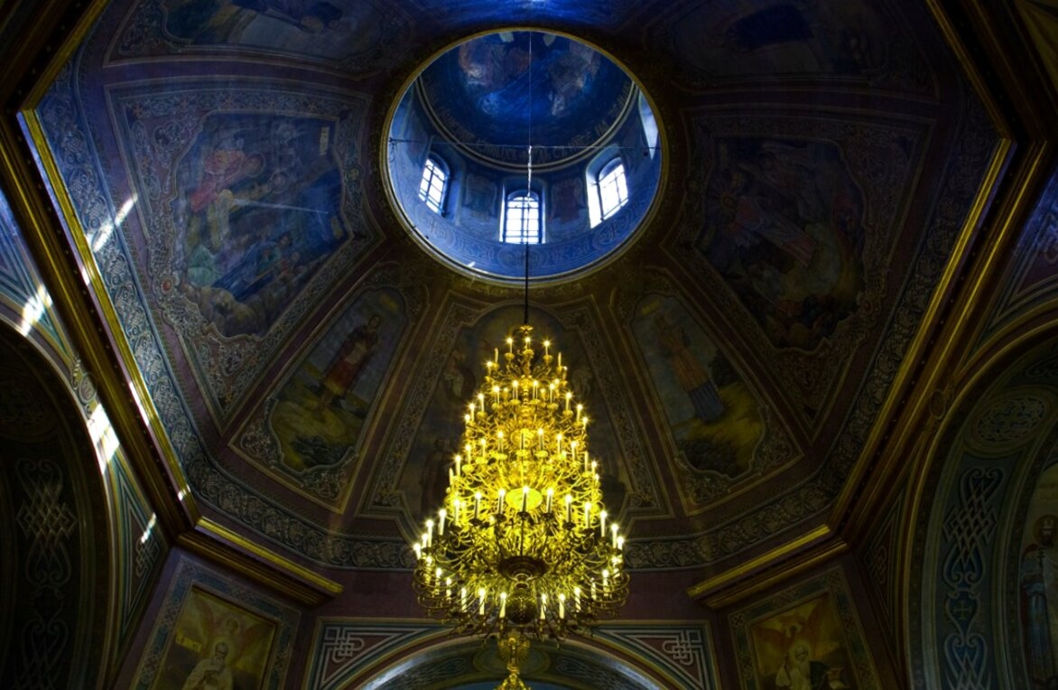 На фотографии запечатлён величественный интерьер соборного храма Вознесенского мужского монастыря в городе Сызрани. Центральным элементом композиции является массивное паникадило, или храмовая люстра, символизирующее собой небесный светильник и исполненное в лучших традициях церковного искусства. Его сложная форма и многочисленные свечи предназначены для освещения всего пространства храма, создавая молитвенную атмосферу и устремляя взор верующих ввысь.