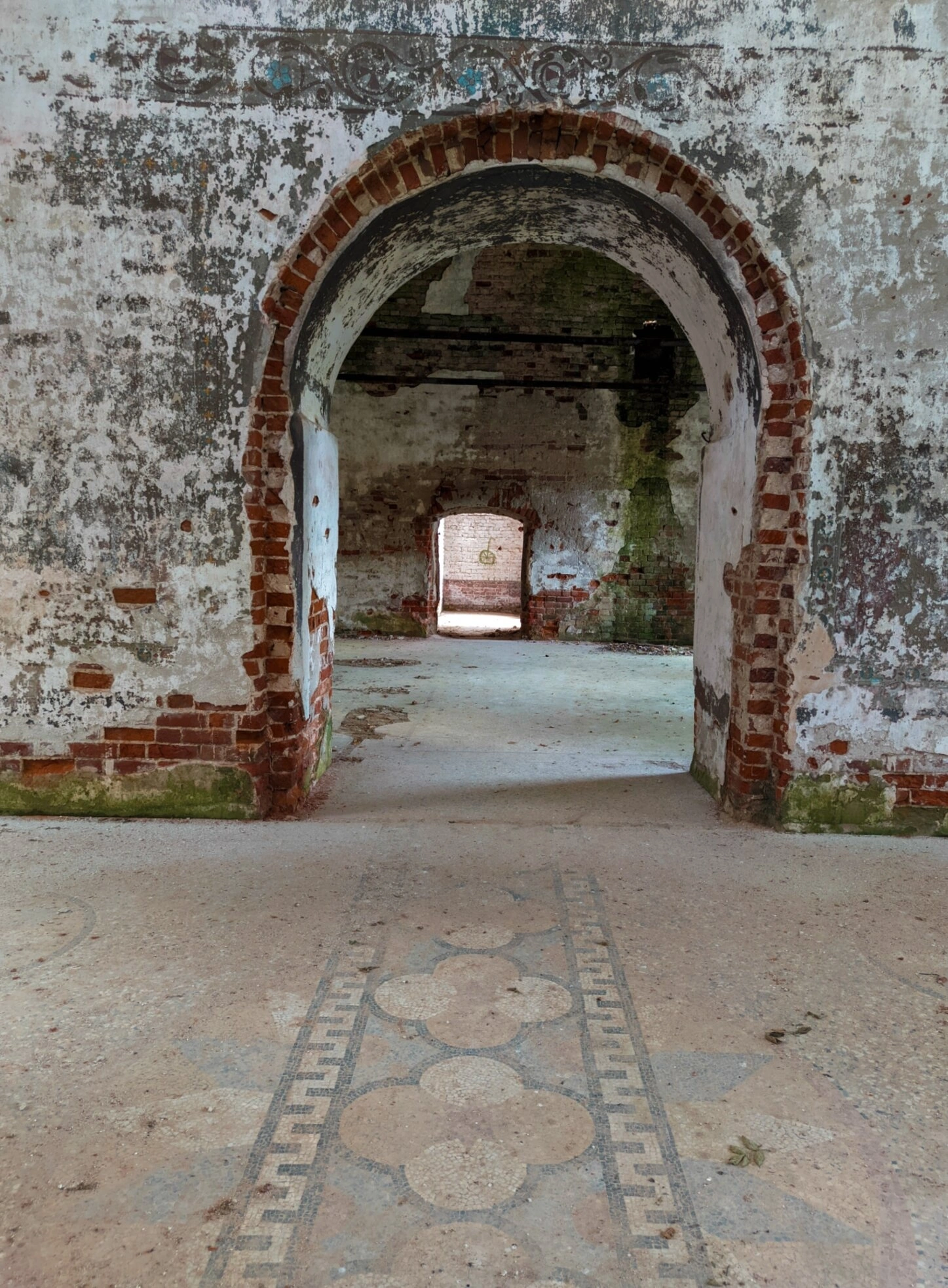 В центральной части композиции видны две массивные кирпичные арки, ведущие в смежные помещения храма. Кирпичная кладка местами осыпалась, а поверхности стен покрыты многочисленными следами сырости и временного запустения. Естественное освещение проникает через дверные проемы в глубине здания, создавая выразительную игру света и тени на архитектурных элементах.