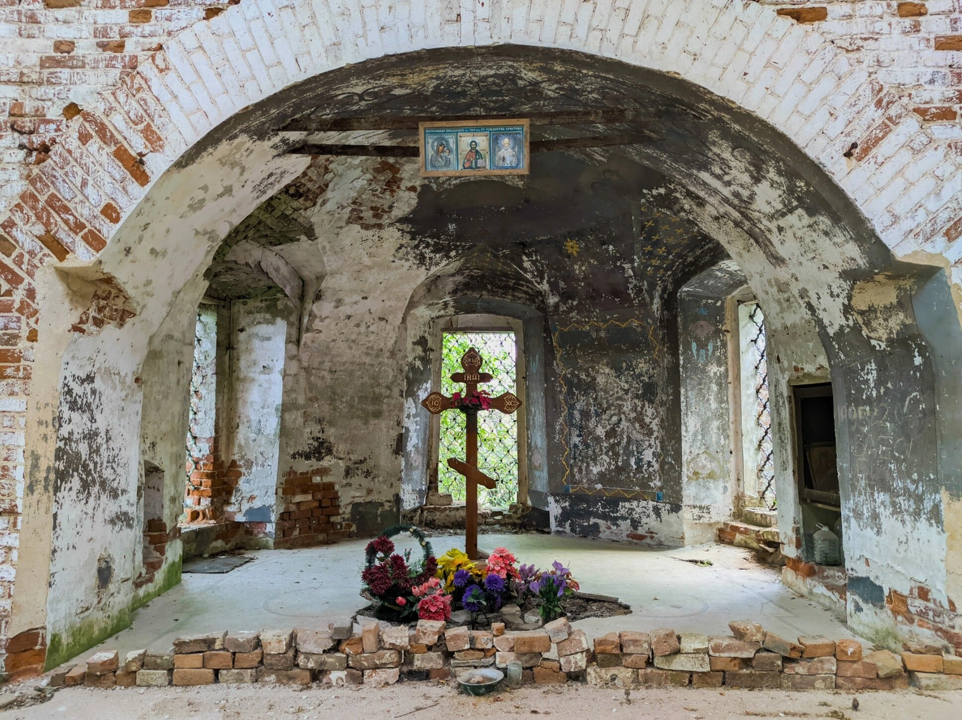 На представленной фотографии запечатлен интерьер храма в честь Вознесения Господня, расположенного в селе Красное Владимирской области. Несмотря на аварийное состояние святыни, в центральной части кадра возвышается деревянный православный крест, установленный на кирпичном основании и украшенный цветочными венками. Это свидетельствует о том, что верующие продолжают почитать это место и совершают здесь молитвы.