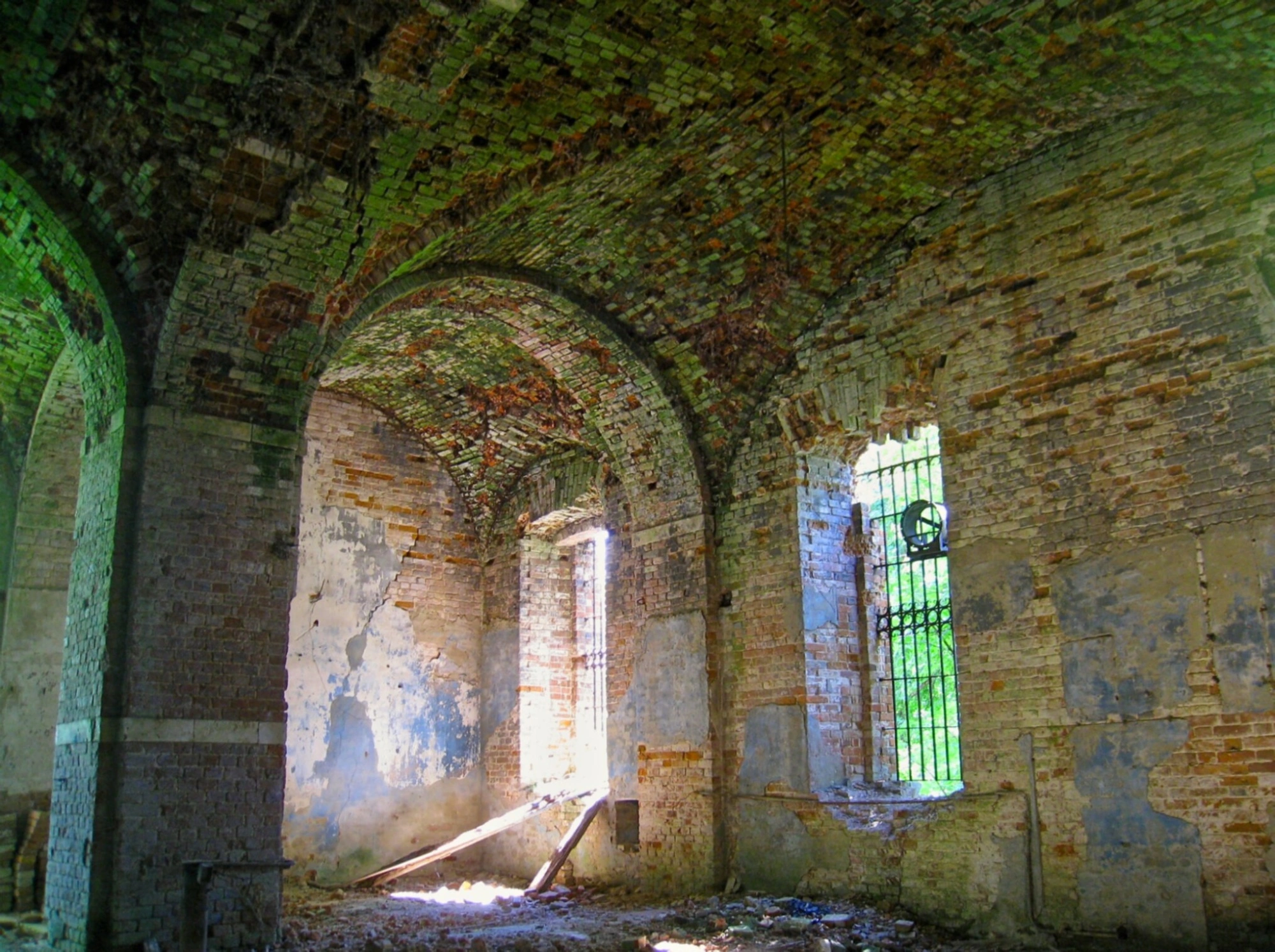 Арочные оконные проемы, характерные для церковной архитектуры, пропускают внутрь потоки солнечного света, которые контрастируют с полумраком заброшенного храма. Один из оконных проемов справа перекрыт решеткой, что свидетельствует о попытках сохранения остатков святыни.