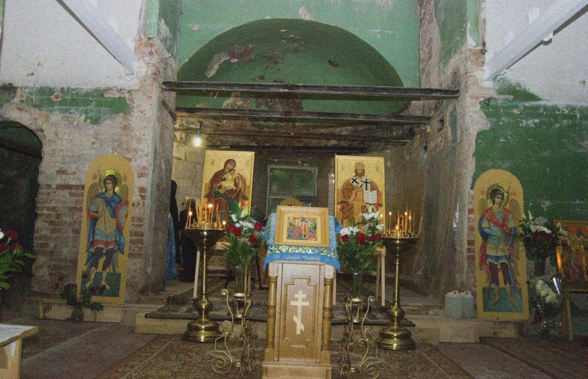 За аналоем видны большие старинные иконы в киотах, изображающие святых угодников. Стены храма, сохранившие следы времени в виде осыпающейся штукатурки, свидетельствуют о древности данной обители, основанной в XVI веке. Несмотря на следы ветхости, атмосфера в храме пронизана благодатью и молитвенной тишиной, создавая ощущение непрерывной духовной связи поколений.