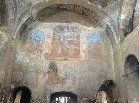 В центральной части снимка просматривается алтарная зона с остатками иконостаса и царскими вратами. На сводах и стенах угадываются фрагменты уникальной настенной росписи, выполненной в традициях православной иконографии. Лики святых и библейские сюжеты, скрытые под слоем времени, свидетельствуют о высоком искусстве безвестных мастеров, трудившихся во славу Божию.