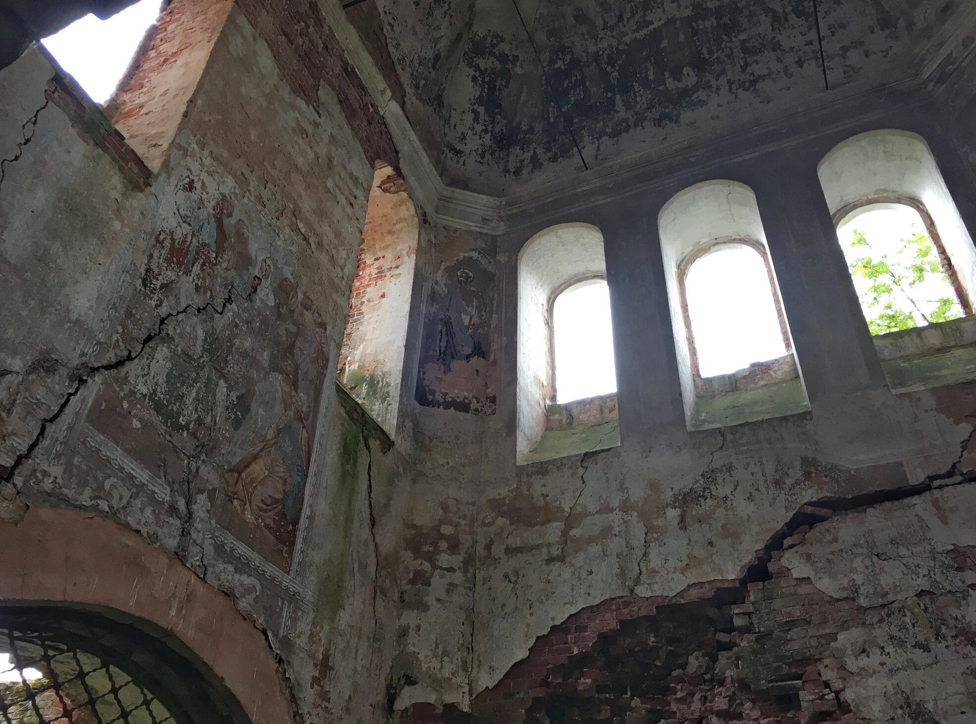 В кадре видны стены и потолочные своды, пребывающие в аварийном состоянии: повсеместно наблюдаются глубокие трещины, осыпающаяся штукатурка, местами обнажена старая кирпичная кладка. На стенах сохранились фрагменты старинных фресок — слева различим крупный участок с потемневшими, выцветшими изображениями святых или библейских сцен, а справа, над окнами, угадываются менее сохранившиеся фрагменты росписей. В правой части кадра расположены три арочных окна, лишённых стёкол; через них проникает яркий дневной свет, освещающий пространство храма. В левом нижнем углу заметна часть арочного проёма, закрытого металлической решёткой.