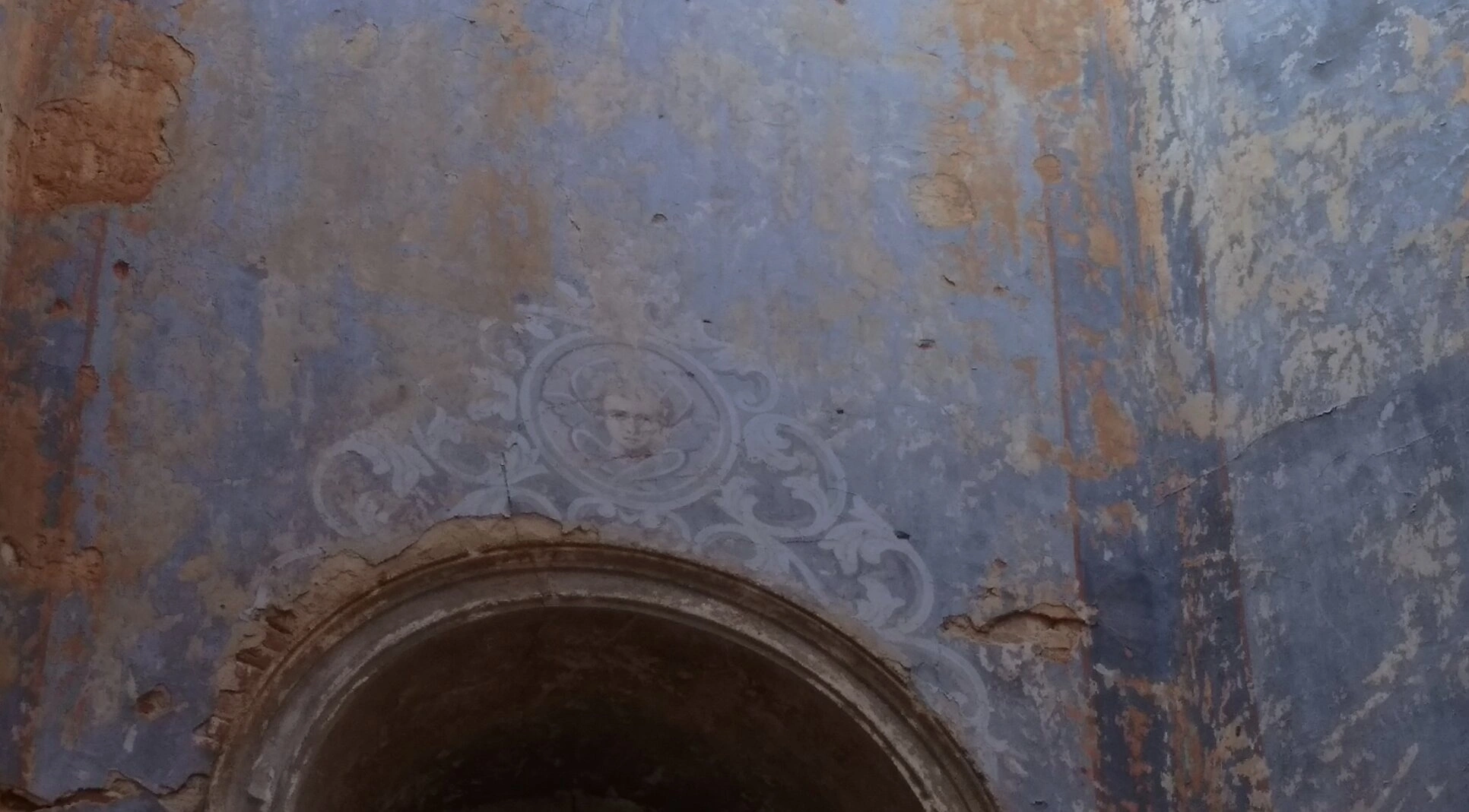 На фотографии запечатлён фрагмент интерьера Введенской церкви, расположенной в селе Чемодановка Пензенской области. Храм освящён в честь Введения во храм Пресвятой Богородицы и представляет собой значительный памятник православной архитектуры. Изображение демонстрирует участок стены с сохранившейся фресковой росписью, выполненной в светлых тонах и обрамлённой орнаментальными элементами. Художественные мотивы включают растительные узоры и лики, характерные для традиционной церковной живописи.