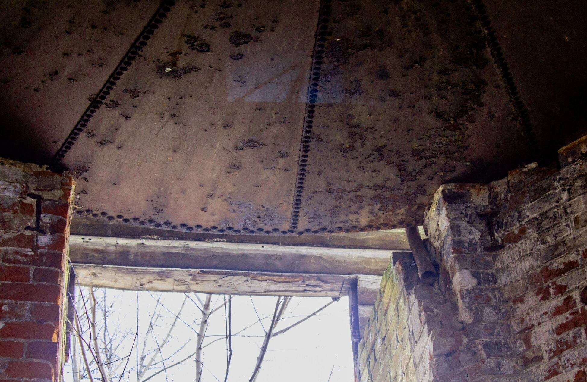 В центре композиции взору открывается величественный металлический купол, некогда венчавший дом Божий. Купольная конструкция, выполненная из клиновидных сегментов, скрепленных рядами заклепок, ныне покрыта слоями ржавчины, что придает ей особый драматизм. Сквозь проем в стене, вероятно, бывшее оконное или дверное отверстие, проникает естественное освещение, выхватывая из полумрака детали разрушающейся архитектуры.