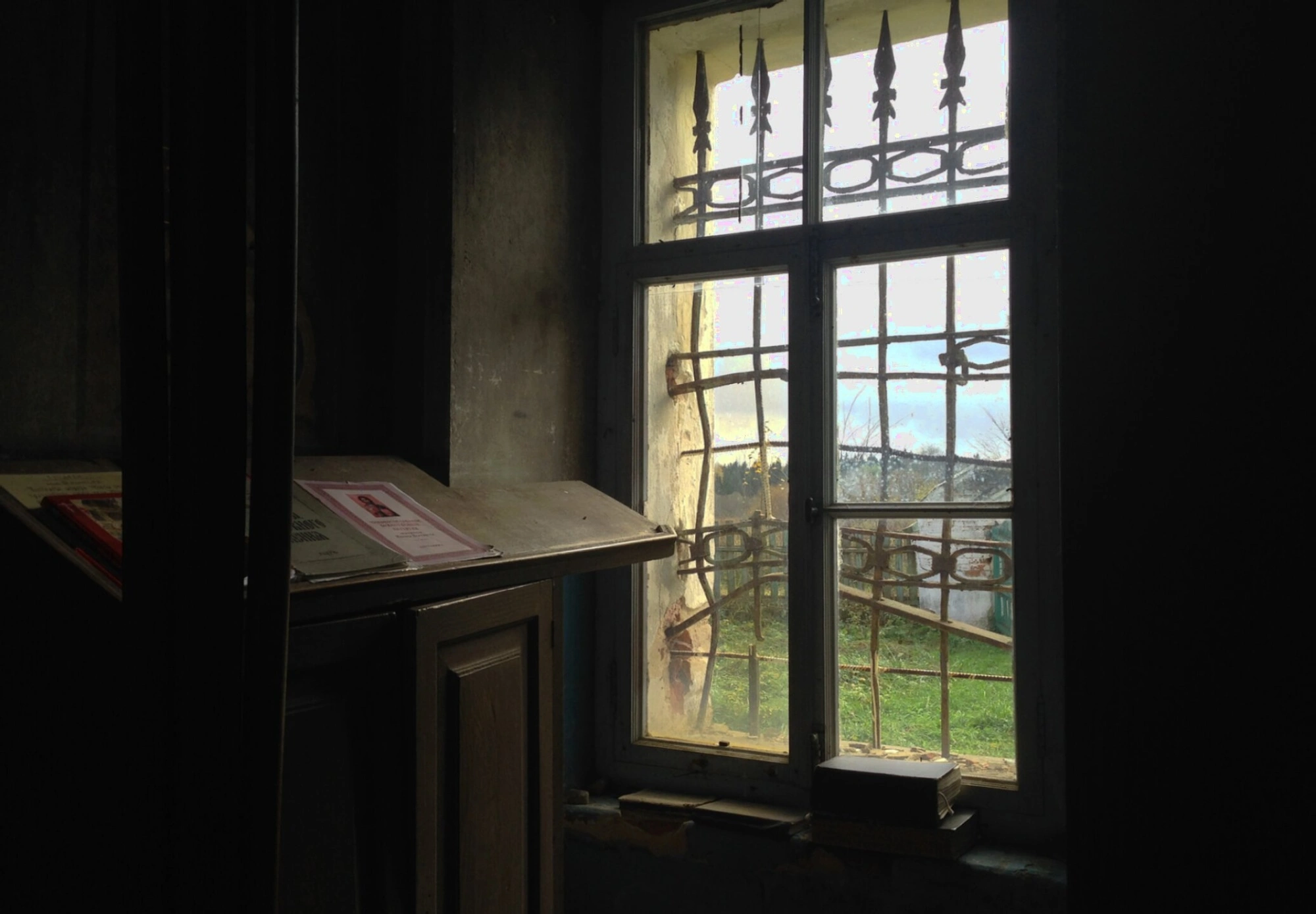 Слева от окна внимание привлекает сохранившийся церковный аналой — специальная подставка для богослужебных книг. На аналое лежит раскрытая книга, вероятно, богослужебное напрестольное Евангелие или иная святыня, оставленная здесь много лет назад. На подоконнике рядом виднеется стопка других церковных книг, покрытых слоем пыли.