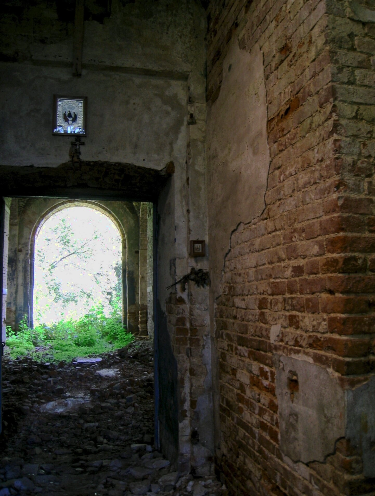 В верхней части стены, над арочным проемом, сохранилась темная табличка или икона в рамке — последний след былого церковного убранства. Вся сцена пронизана противоречивыми чувствами: скорбью о утраченной святыне и надеждой, символически выраженной через пробивающийся свет и живую растительность.