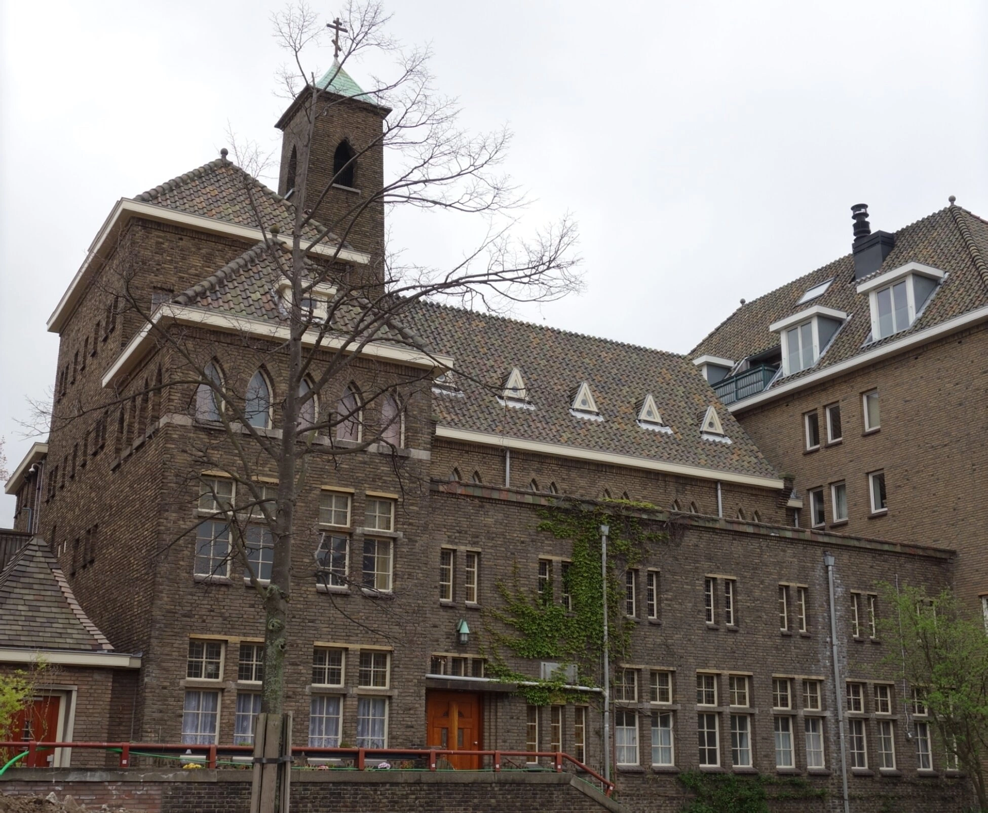 На фотографии запечатлён Иоанно-Предтеченский женский монастырь в Гааге, принадлежащий Гаагской и Нидерландской епархии Русской Православной Церкви. Это здание, расположенное по адресу Doctor Kuyperstraat 2, является духовным центром русского православия в Нидерландах и отличается характерной для местной архитектуры кирпичной кладкой и строгими формами, увенчанными православным крестом на колокольне.