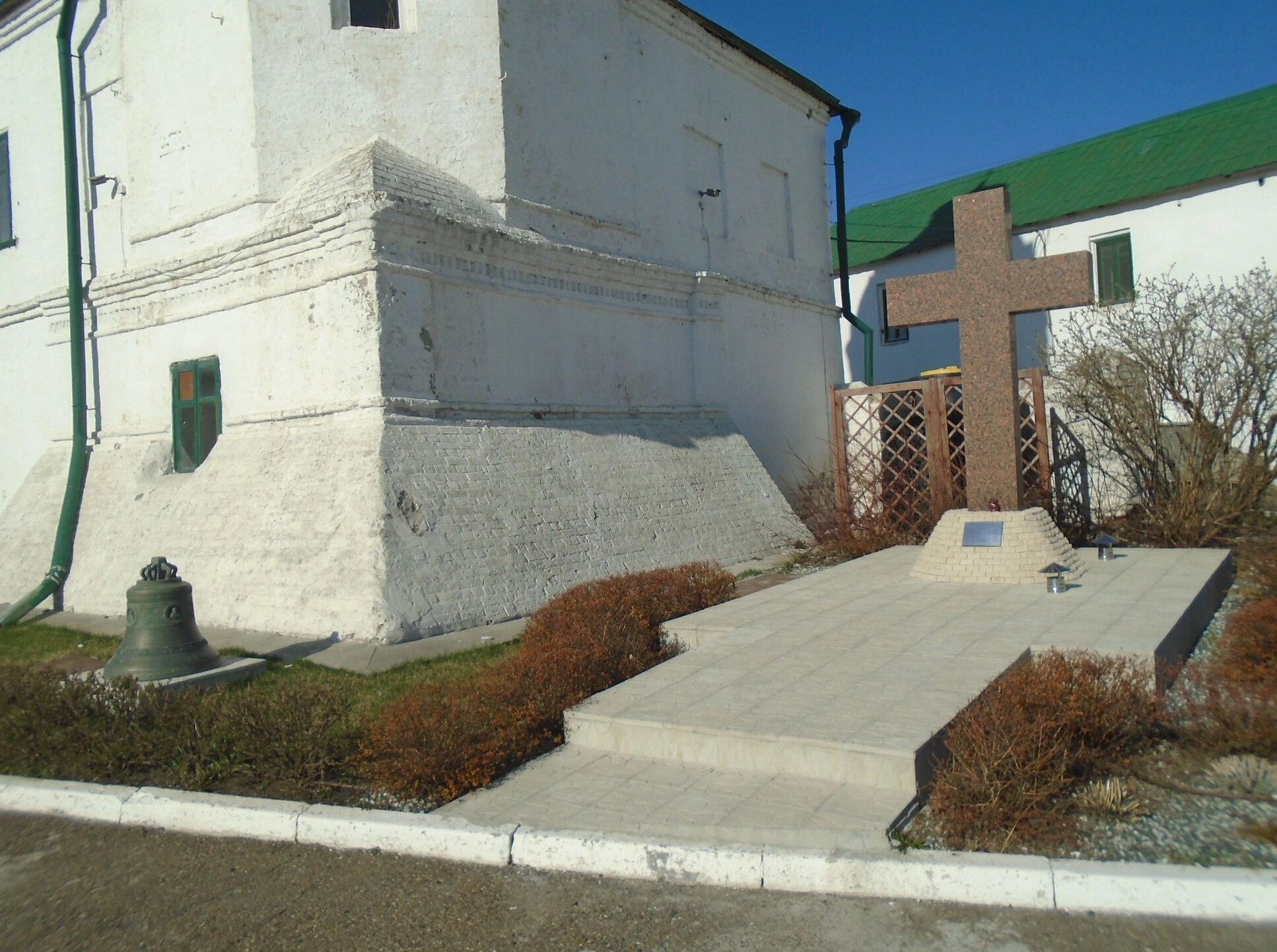 На переднем плане изображения установлен памятный поклонный крест, высеченный из камня и водружённый на массивное основание. Рядом с крестом, на ухоженной земле, благоговейно положен церковный колокол, символизирующий голос веры и призыв к молитве. Данная композиция likely знаменует собой памятное место или событие в истории монастыря.
