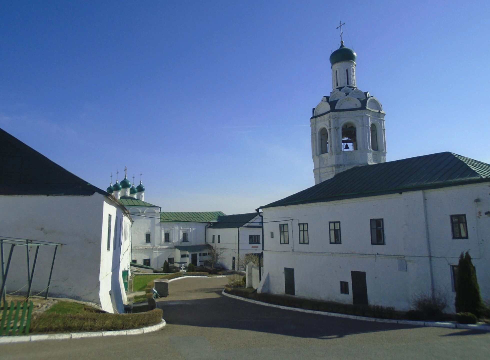 На снимке прекрасно видны ухоженные территории монастыря, украшенные цветущими розами и аккуратно вымощенными дорожками, что создаёт атмосферу благодати и умиротворения. Белоснежные стены храмовых построек гармонично сочетаются с зелёными кровлями и сияющими на солнце золотыми куполами, увенчанными православными крестами. Архитектурный ансамбль монастыря, выполненный в лучших традициях русского церковного зодчества, включает в себя несколько храмов и хозяйственных построек.