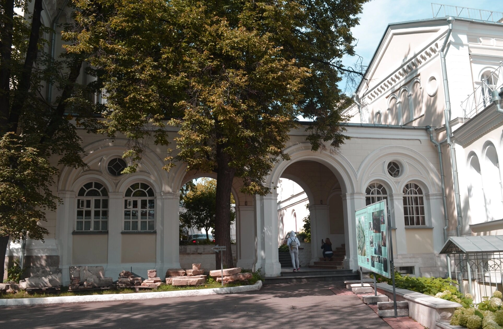 На фотографии запечатлён живописный вид на Иоанно-Предтеченский ставропигиальный женский монастырь, что расположен в самом сердце Москвы. Снимок открывает взору арочный проход, ведущий во внутреннее пространство святой обители, и позволяет рассмотреть фасады монастырских построек, утопающих в зелени.