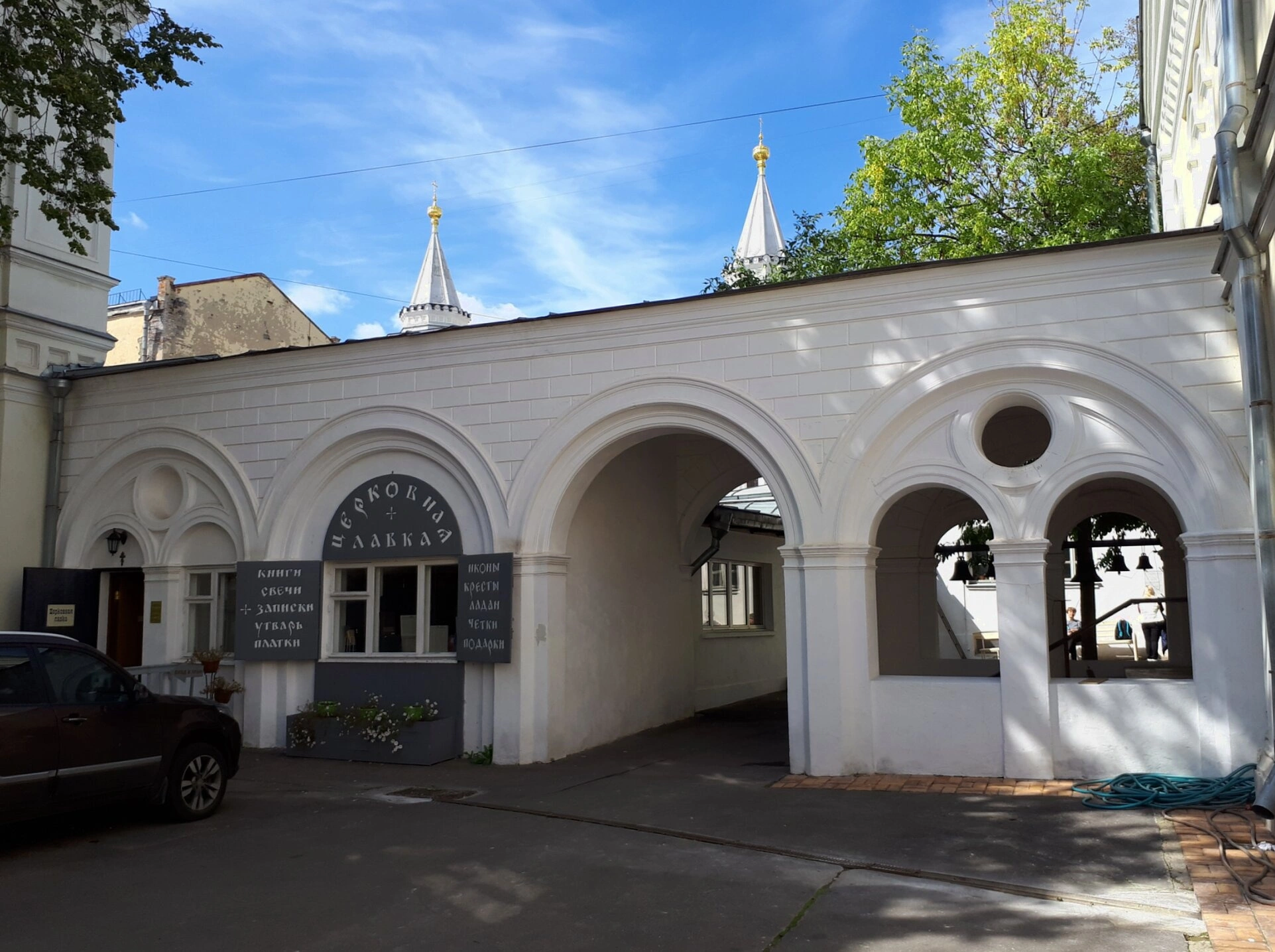 На снимке изображён фрагмент монастырского комплекса с характерными арочными проёмами и элементами церковного зодчества. На заднем плане виднеются величественные купола храмов, увенчанные православными крестами, сияющими в лучах солнечного света. Присутствующая на фотографии вывеска «Церковная лавка» свидетельствует о активной духовной жизни монастыря, где паломники могут приобрести церковную утварь, духовную литературу и свечи.
