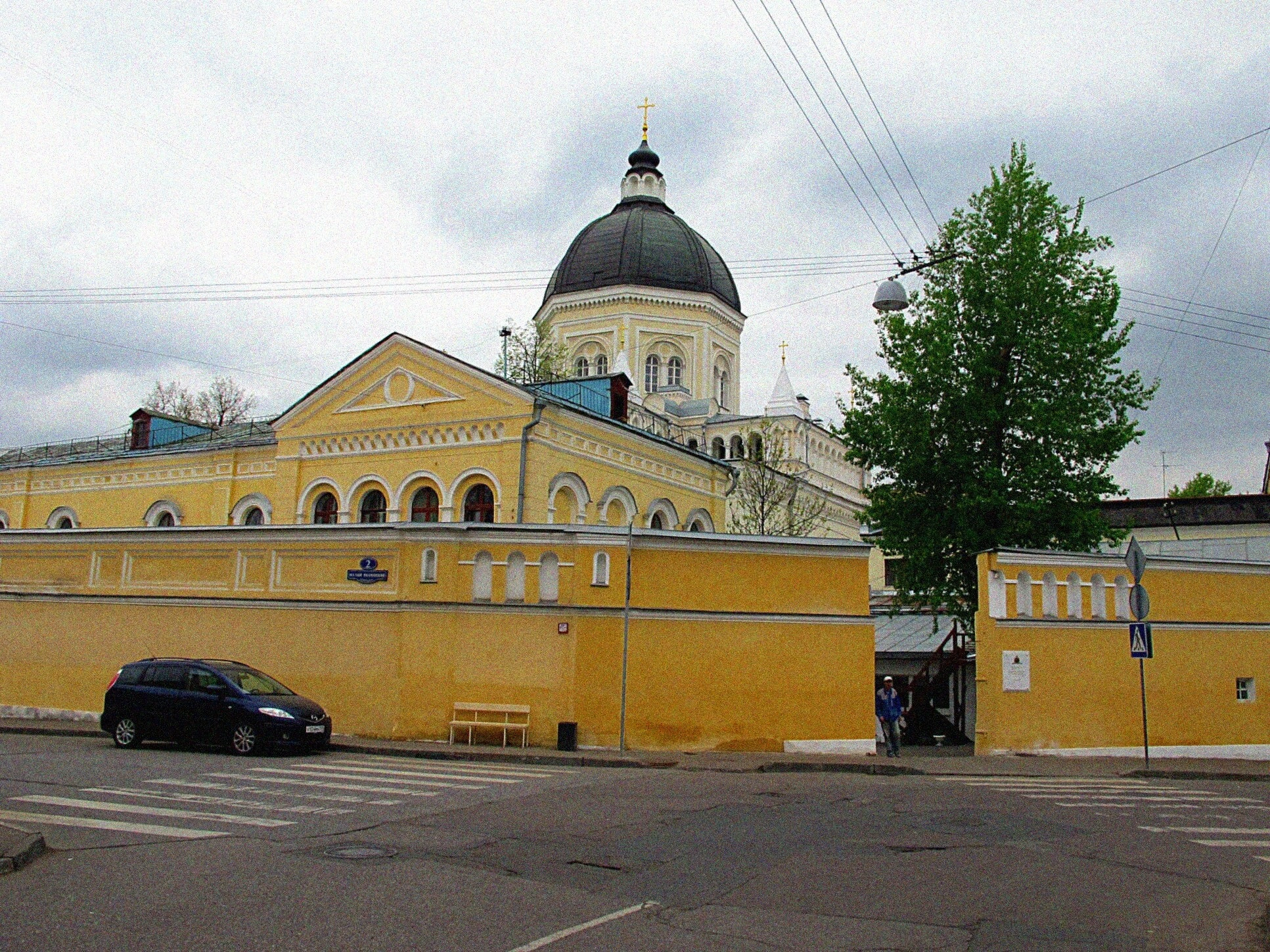 На фотографии также видна прилегающая городская инфраструктура: дорога с пешеходным переходом, уличные фонари и зелёные насаждения, что подчёркивает, как святая обитель органично существует в ритме современного мегаполиса, оставаясь островком молитвенного покоя и духовной крепости. Небо в момент съёмки было затянуто облаками, что придаёт кадру особое, созерцательное настроение.