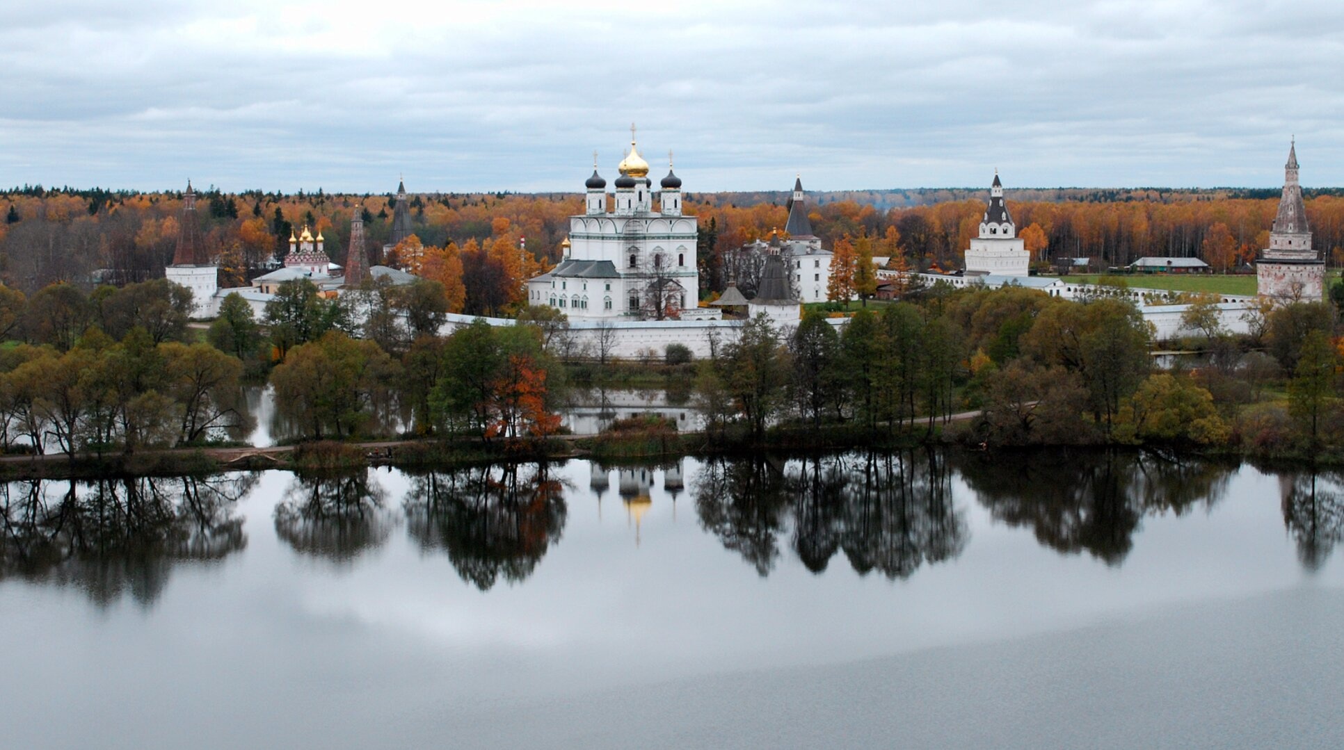 Белокаменные стены храмов и золотые купола, сияющие даже под покровом осенних облаков, величаво отражаются в спокойной глади водоёма. Особой красотой выделяются Успенский собор и колокольня, являющиеся архитектурными доминантами всей композиции. Окружающий монастырь осенний лес, окрашенный в золотые и багряные тона, подчёркивает уединённость и духовную сосредоточенность этого святого места.