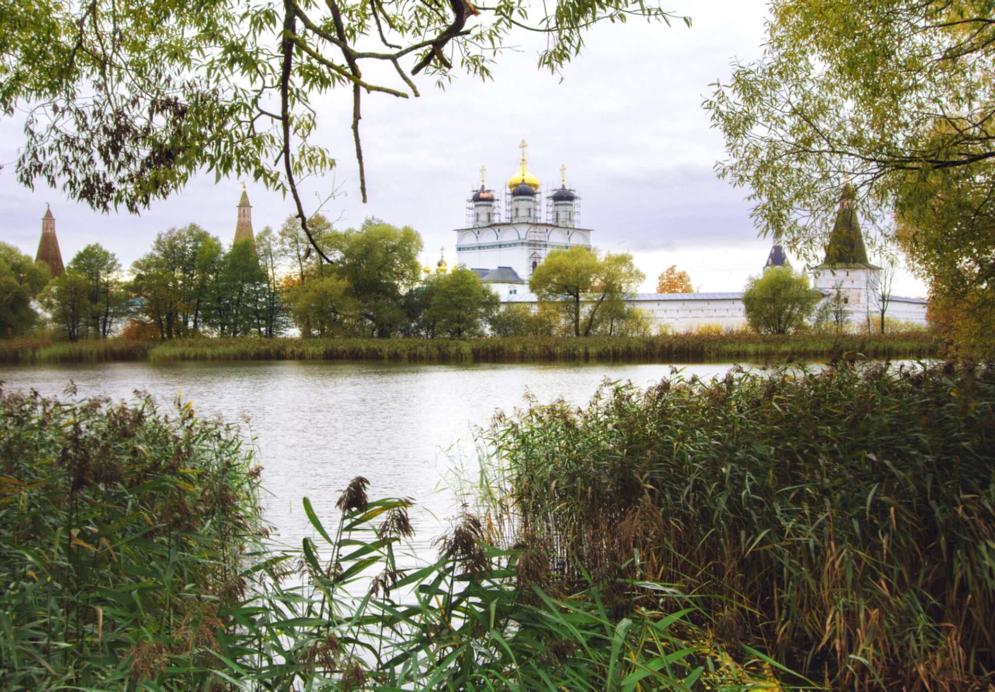 На представленной фотографии запечатлён величественный ансамбль Иосифо-Волоцкого монастыря, отражающийся в водах древнего монастырского пруда. На переднем плане изображён водоём, известный как Иосифовский пруд, выкопанный ещё при жизни основателя обители преподобного Иосифа Волоцкого. Прибрежная растительность, включая тростник и деревья с золотистой осенней листвой, обрамляет священный пейзаж, создавая ощущение благоговейной тишины и умиротворения.
