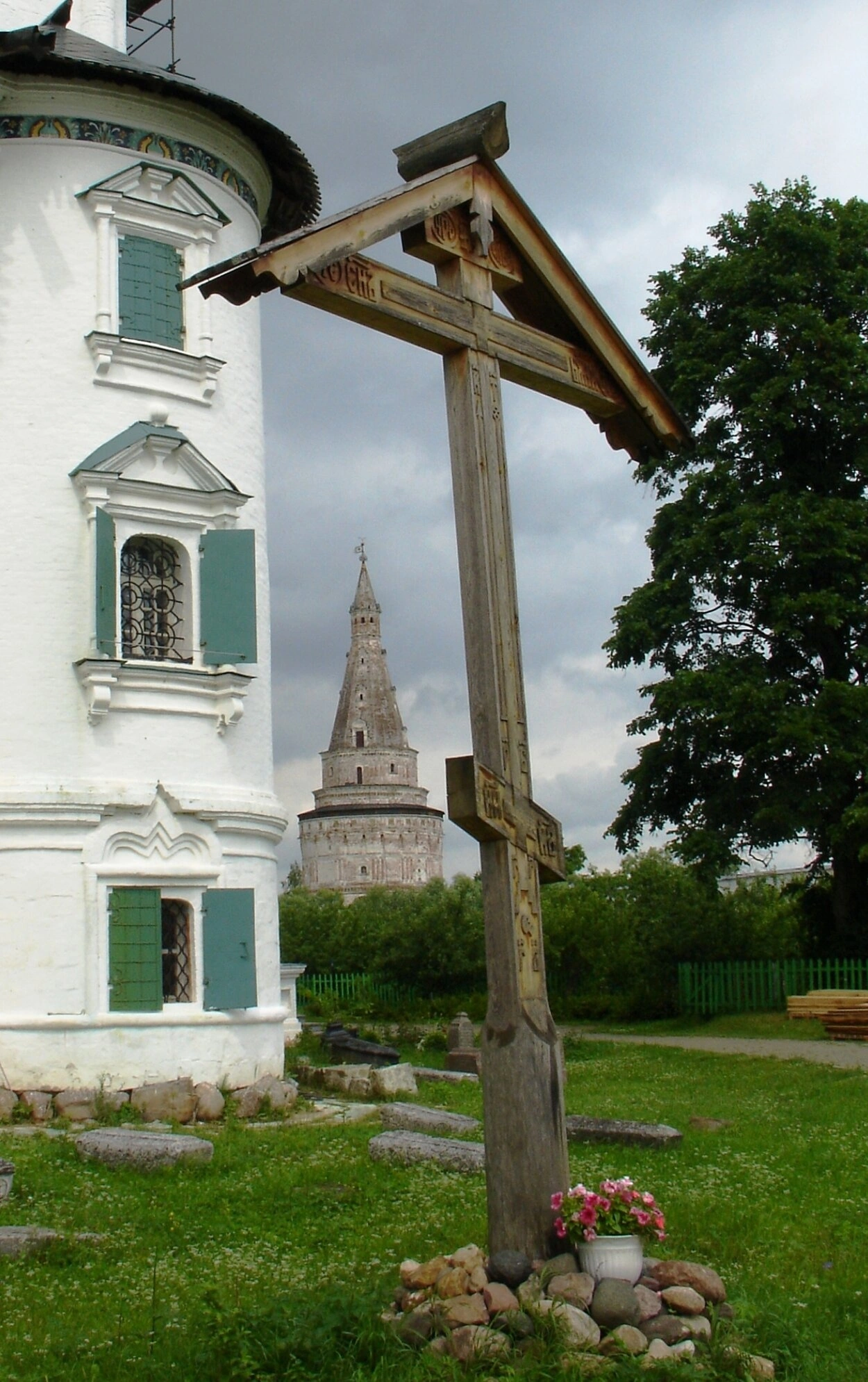 На представленной фотографии запечатлён живописный уголок территории Свято-Успенского Иосифо-Волоцкого ставропигиального мужского монастыря. В фокусе снимка находится высокий деревянный поклонный крест, установленный на благословенной земле обители. За ним виден фасад одного из монастырских зданий, выкрашенный в белый цвет и украшенный зелёными ставнями, что создаёт ощущение уюта и строгого монашеского быта.