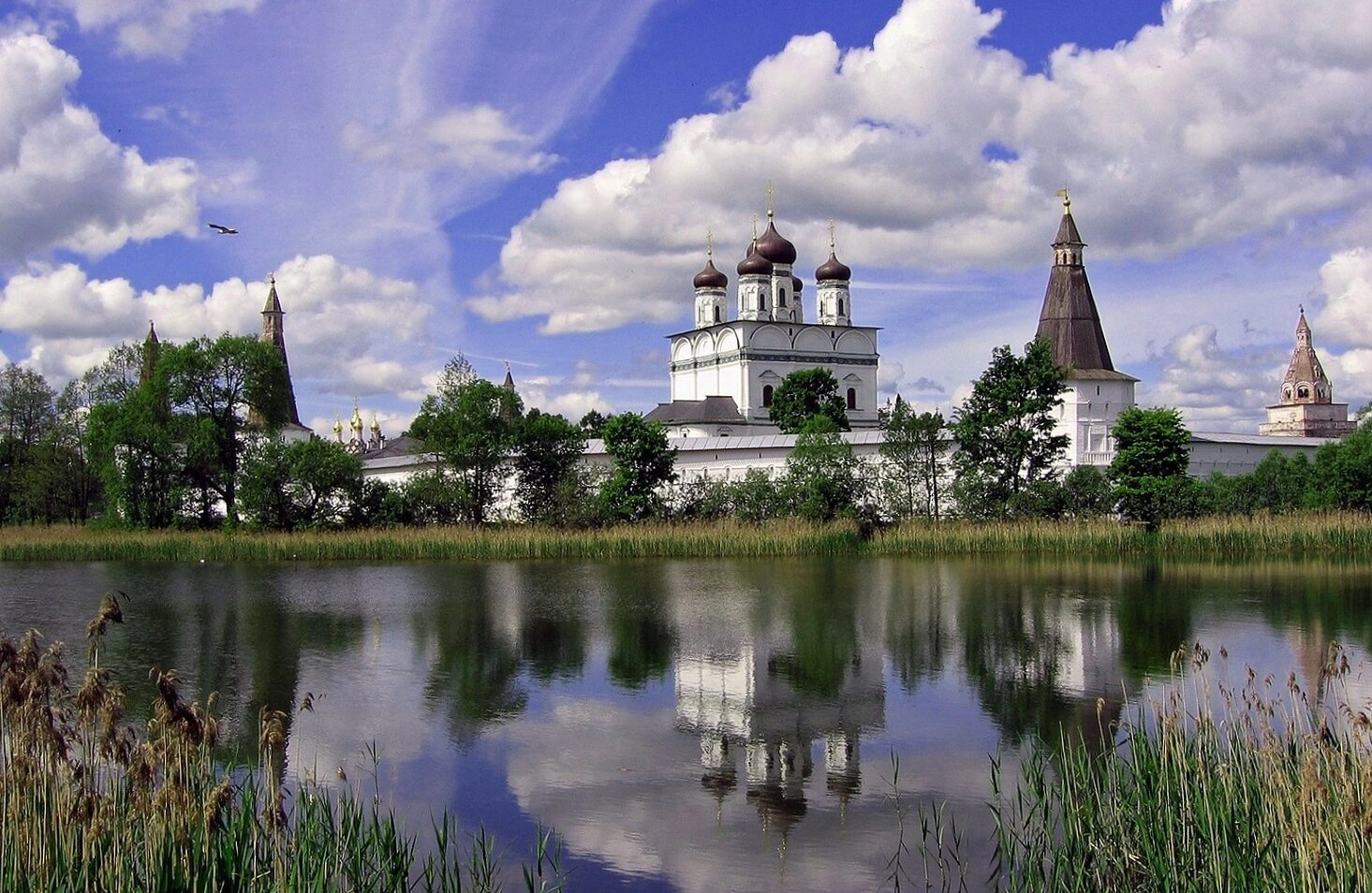 Монастырский комплекс, обнесённый мощными крепостными стенами с башнями, воплощает в себе образ Небесного Иерусалима на земле. Зелень деревьев и прибрежные камыши мягко обрамляют святую обитель, органично вписывая творение рук человеческих в божественную природу. Купола, устремлённые ввысь, гармонируют с чистым голубым небом и лёгкими облаками, напоминая о вечной жизни и горнем мире.