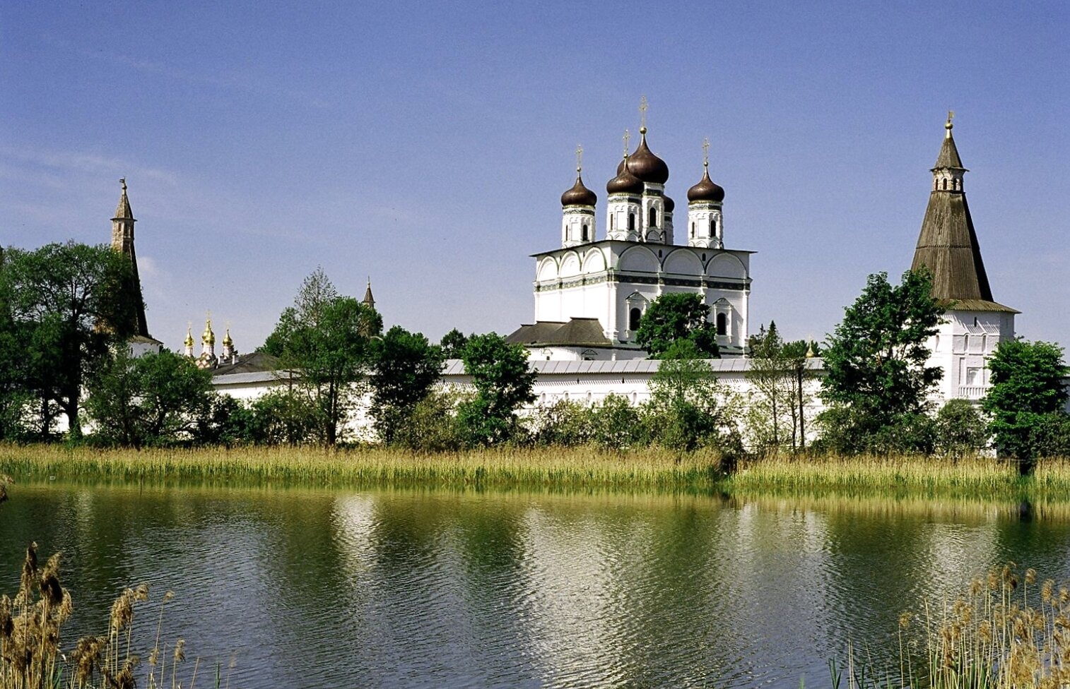 Белокаменные стены и золотые купола собора гармонично сочетаются с окружающим пейзажем, подчёркивая духовную значимость этого места. Зелёная растительность по берегам пруда и камыши на переднем плане добавляют фотографии естественной природной красоты и умиротворённости. Данный ракурс позволяет оценить не только архитектурное величие монастыря-крепости, но и его уникальное расположение среди водной глади, что всегда имело как оборонительное, так и духовное значение, символизируя очищение и отрешение от мирской суеты.