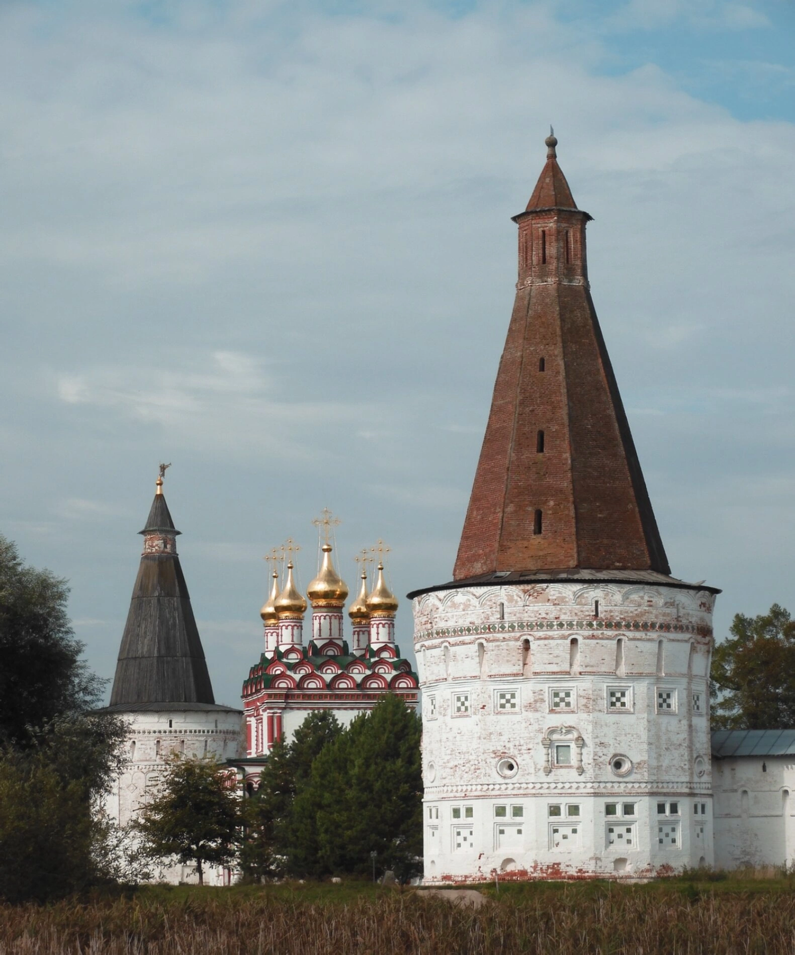 На переднем плане снимка видны мощные крепостные стены и строгие шатровые башни, возведённые в XVI-XVII веках, которые придают монастырю вид неприступной крепости. Эти укрепления свидетельствуют о важной оборонительной роли обители на подступах к Москве в смутные времена.