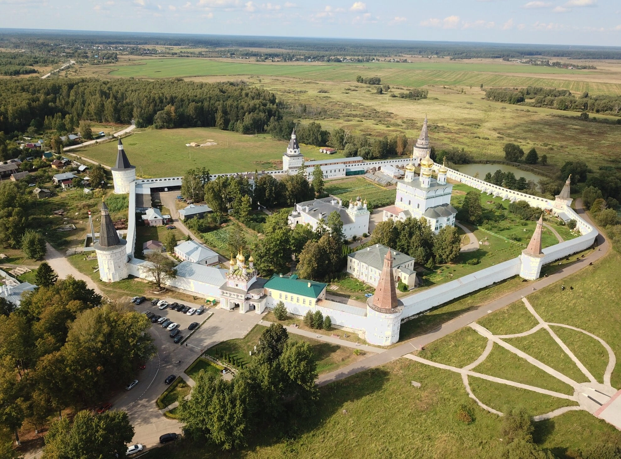 На представленной фотографии запечатлён величественный ансамбль Иосифо-Волоцкого ставропигиального мужского монастыря, вид с высоты птичьего полёта. Святая обитель, основанная в XV веке преподобным Иосифом Волоцким, располагается в селе Теряево Волоколамского городского округа Московской области. Монастырь, также известный как Успенский Иосифо-Волоцкий, является одним из значительных центров православной духовности и русской культуры.