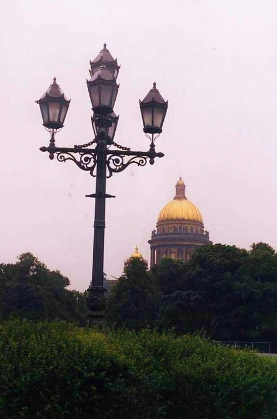 На представленной фотографии запечатлён Исаакиевский собор — величественный православный храм в Санкт-Петербурге. Композиция снимка выстроена таким образом, что на переднем плане выделяется богато украшенный чугунный уличный фонарь, а на заднем плане, сквозь зелёную листву, сияют золотые купола собора.