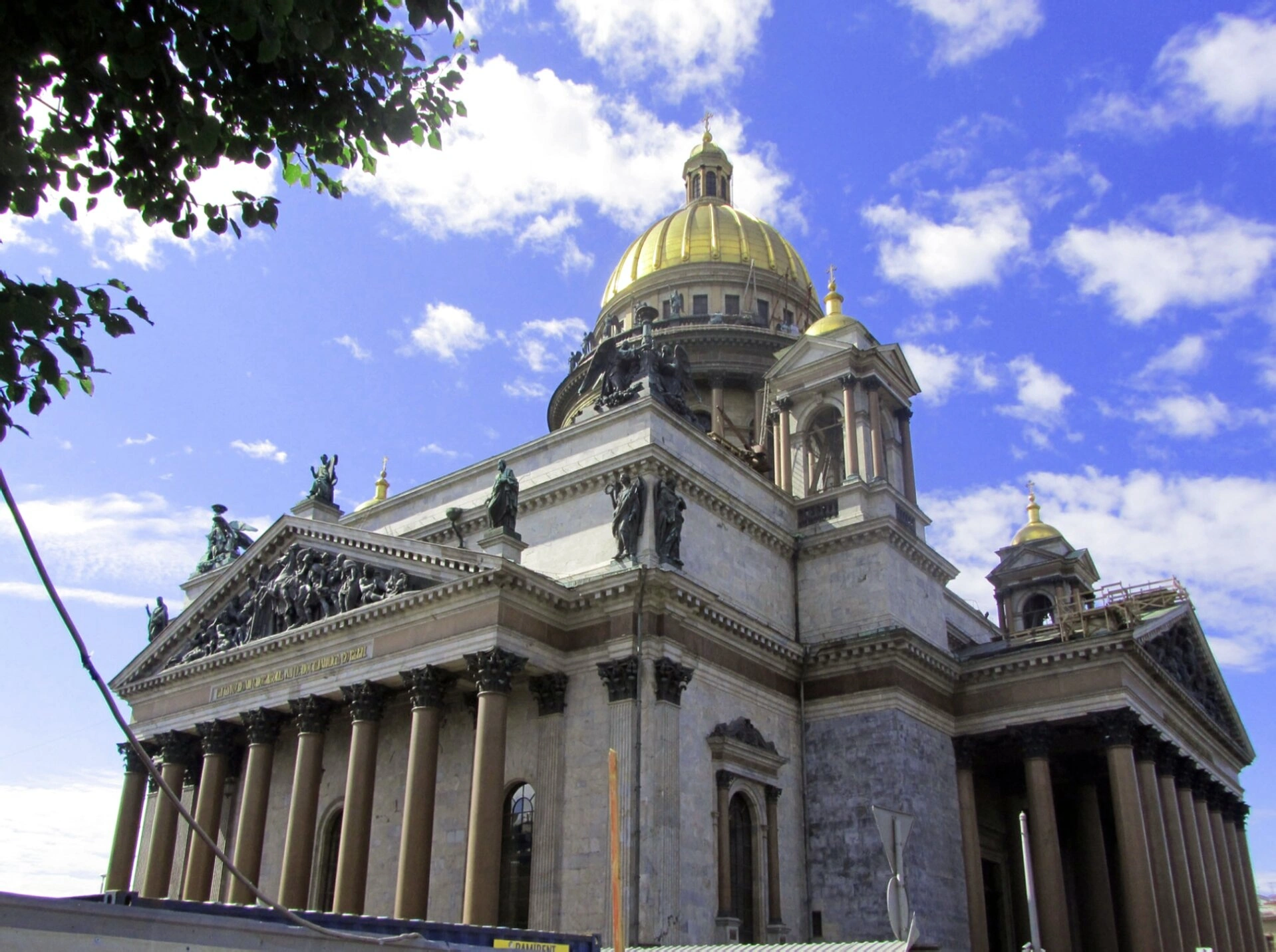 На представленной фотографии запечатлён величественный Исаакиевский собор, кафедральный православный храм Санкт-Петербурга, посвящённый преподобному Исаакию Далматскому. Снимок сделан с уровня земли в яркий солнечный день и позволяет созерцать монументальную красоту этого архитектурного шедевра, занимающего почётное место на Исаакиевской площади. Композиция фотографии выстроена таким образом, что взгляд невольно устремляется ввысь, следуя от мощных колонн портика к сияющему куполу, увенчанному крестом и теряющемуся в пушистых облаках голубого неба.