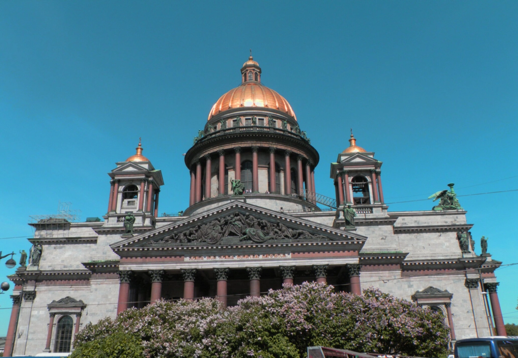 На представленной фотографии запечатлён величественный Исаакиевский собор, кафедральный храм Санкт-Петербургской епархии, освящённый во имя преподобного Исаакия Далматского. Снимок сделан в тёплое время года, о чём свидетельствуют пышные кусты сирени на переднем плане. Архитектурная доминанта композиции — монументальный золочёный купол собора, возносящийся к ясному небу. Этот купол, один из крупнейших в мире, изготовлен из металлических конструкций и покрыт сотней килограммов червонного золота.