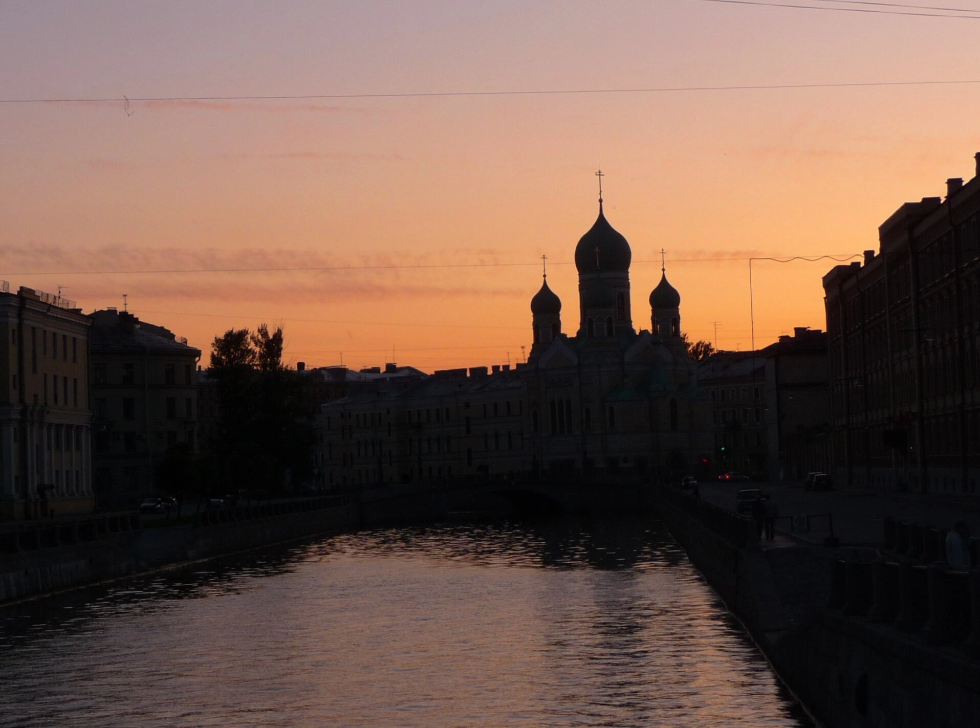 На представленной фотографии запечатлен величественный вид на канал Грибоедова в Санкт-Петербурге в часы заката. В центре композиции возвышается благолепный силуэт церкви Шестоковской иконы Божией Матери, более известной как Исидоровская церковь, освященной в честь святого Исидора Юрьевского.