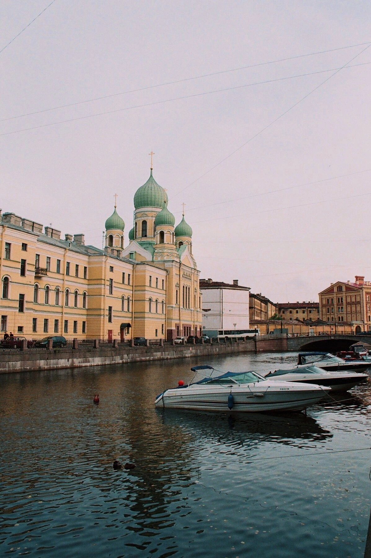 По берегу канала можно заметить несколько пришвартованных лодок и катеров, что добавляет снимку элемент повседневной жизни города. Архитектурный ансамбль дополняют характерные для Санкт-Петербурга здания с жёлтыми фасадами и многочисленными окнами. Пасмурная погода с облачным небом придаёт фотографии особое настроение, свойственное атмосфере северной Венеции.