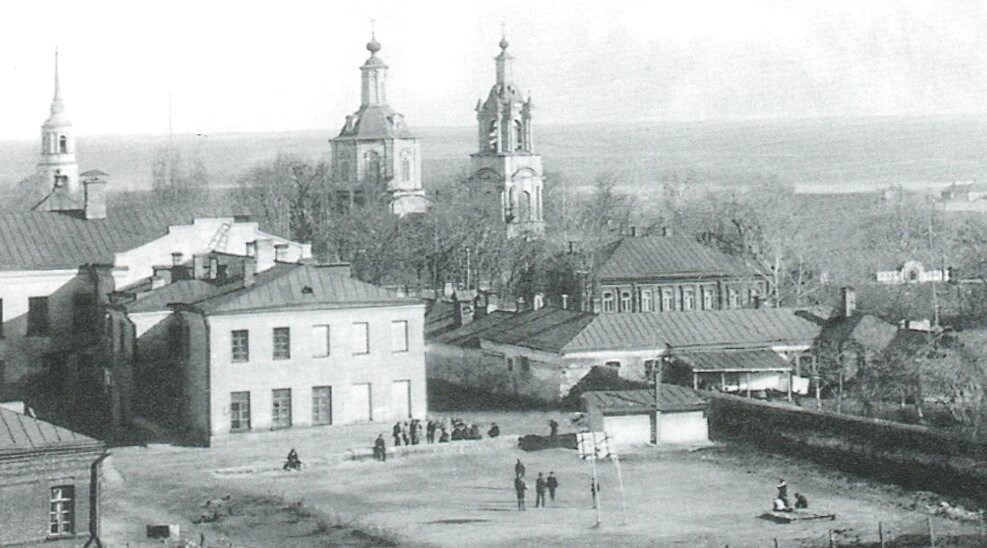 На переднем плане фотографии просматривается площадь, окруженная исторической застройкой, характерной для Воронежа конца XIX - начала XX века. Отсутствие современных элементов на снимке свидетельствует о том, что фотография была сделана в дореволюционный период, сохраняя для потомков облик утраченного исторического ландшафта города.