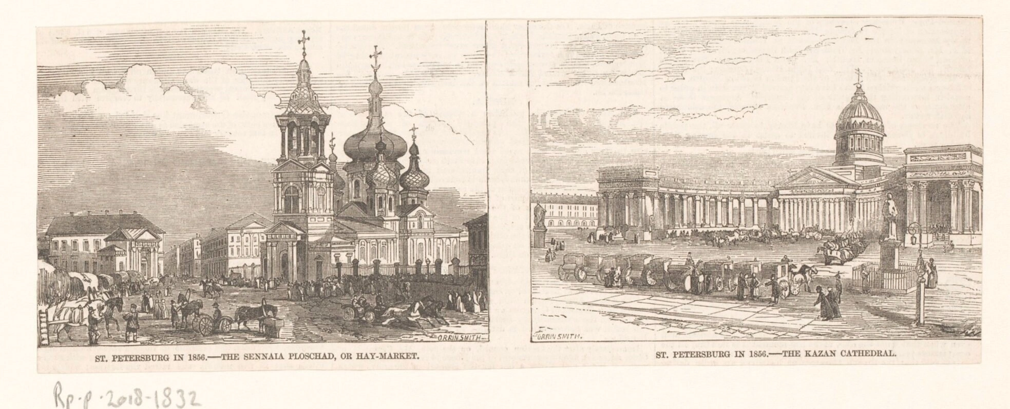 Историческая гравюра: Фото церкви Спаса на Сенной и Казанский собор в Санкт-Петербурге