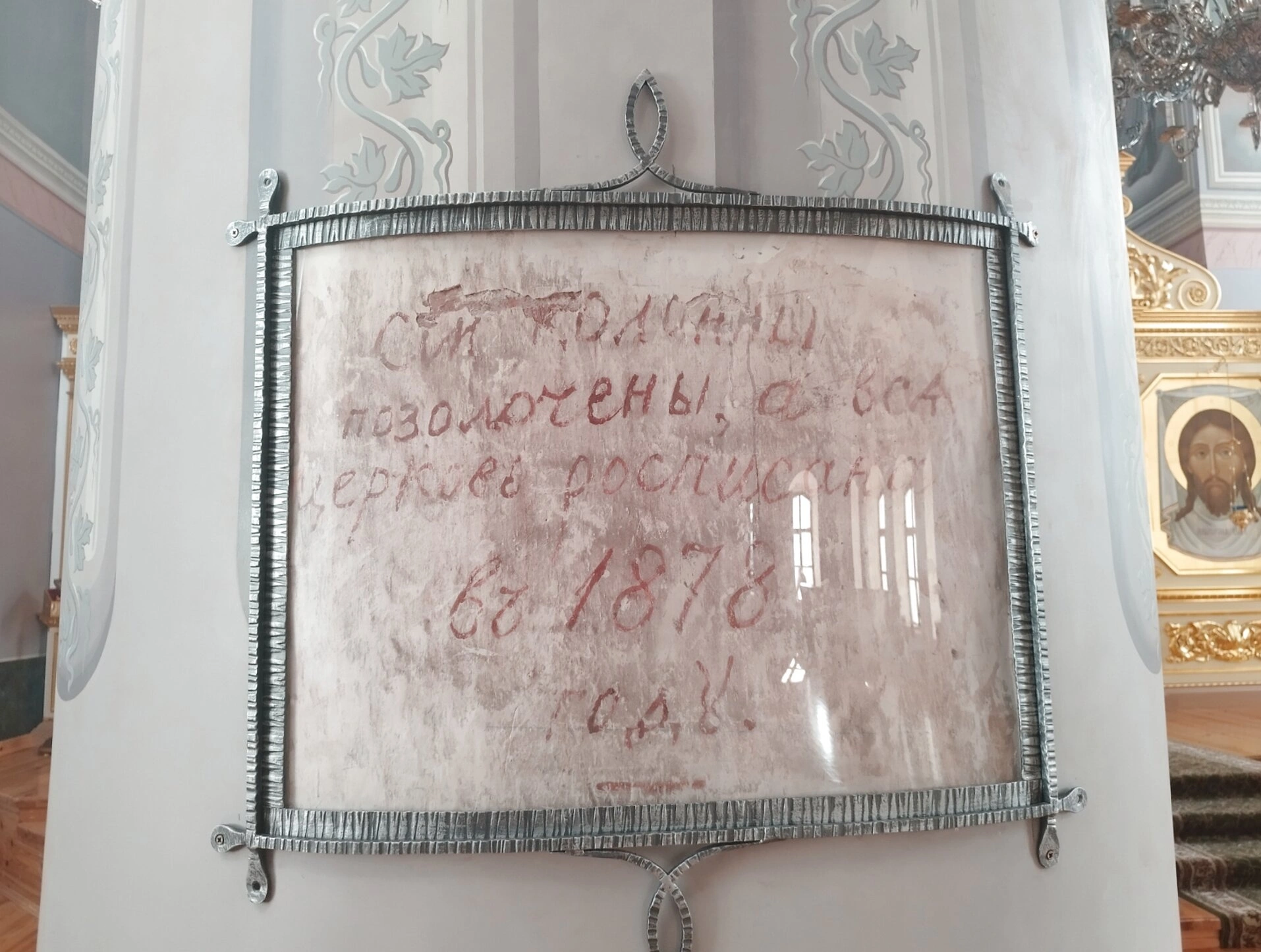 Справа от таблички видна часть величественного позолоченного иконостаса, увенчанного образом Спасителя. Богатое убранство, включающее резьбу по дереву с золочением и многочисленные иконы, характерно для лучших традиций русского церковного искусства второй половины XIX столетия. Освещение работ в 1878 году соответствует периоду расцвета храмового зодчества и искусства в Российской Империи, когда особое внимание уделялось благолепию домов Божиих.