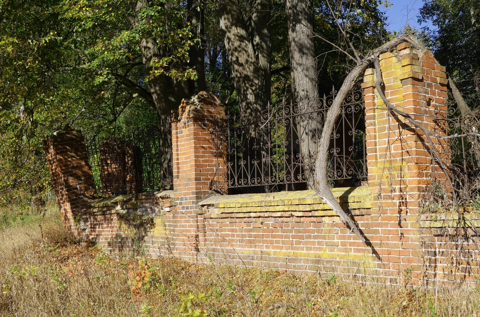 Центральным элементом композиции выступает сохранившийся фрагмент кованой решетки, украшенный искусными декоративными элементами. Ажурные изогнутые узоры кузнечной работы свидетельствуют о высоком мастерстве создателей ограды. Кирпичные столбы, поддерживающие решетчатые конструкции, также показывают следы временного износа, при этом правый столб отличается вертикальными архитектурными выступами.