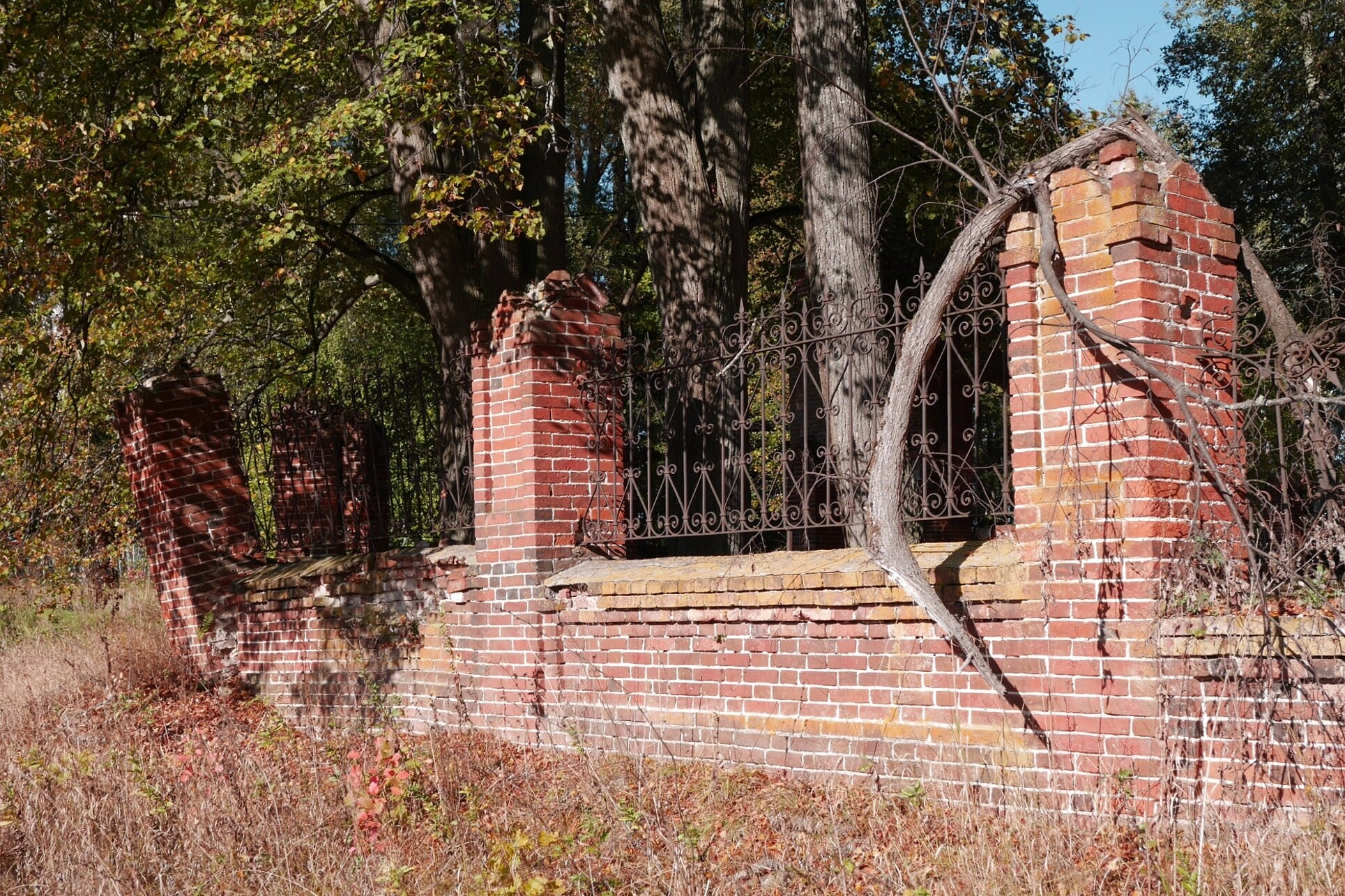 Фотография демонстрирует сохранившийся участок кирпичной стены с элементами кованой металлической ограды, которая традиционно окружает церковные территории в русской православной традиции. Подобные ограды не только выполняли практическую функцию обозначения границ святого места, но и имели глубокое символическое значение, отделяя мирское пространство от территории дома Божьего.