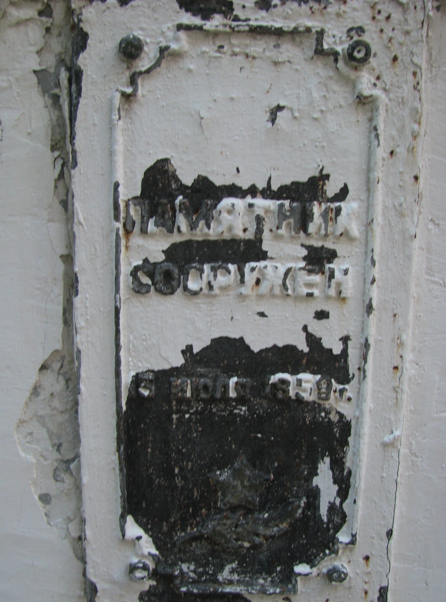 Мемориальная табличка, изображённая на фотографии, служит напоминанием о дате создания данного памятника церковного зодчества. Несмотря на повреждения, она продолжает нести свою мемориальную функцию, являясь неотъемлемой частью исторического облика этой православной святыни.