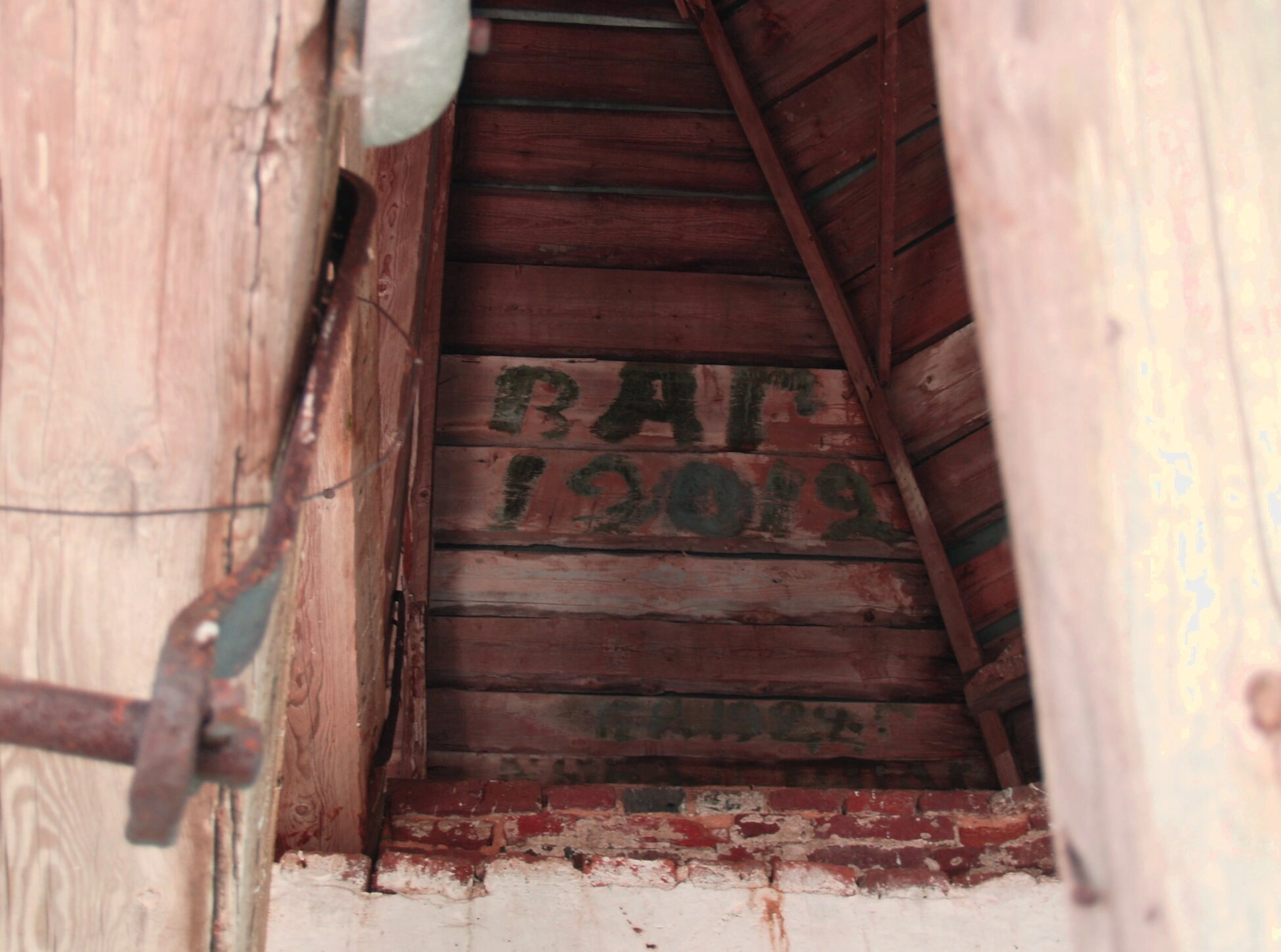 Внимание приковывает массивная деревянная конструкция, состоящая из мощных балок и тёсаных досок. На одной из них сохранилась нанесённая краской надпись, где отчётливо читается часть «ВАТ» и знаменательная дата — «1901». Эта маркировка, вероятно, указывает на время проведения значительных строительных или ремонтных работ по обустройству кровли и чердачного перекрытия храма.
