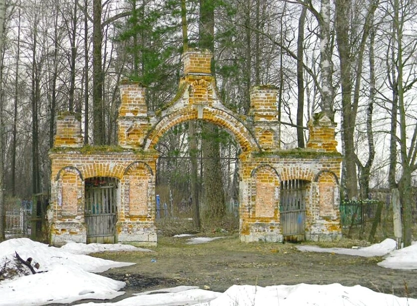 На представленной фотографии запечатлены исторические ворота ограды храма Рождества Христова, расположенного в селе Воскресенское Савинского района. Врата, выполненные из красного кирпича, находятся в полуразрушенном состоянии, что свидетельствует о длительном периоде забвения святого места.