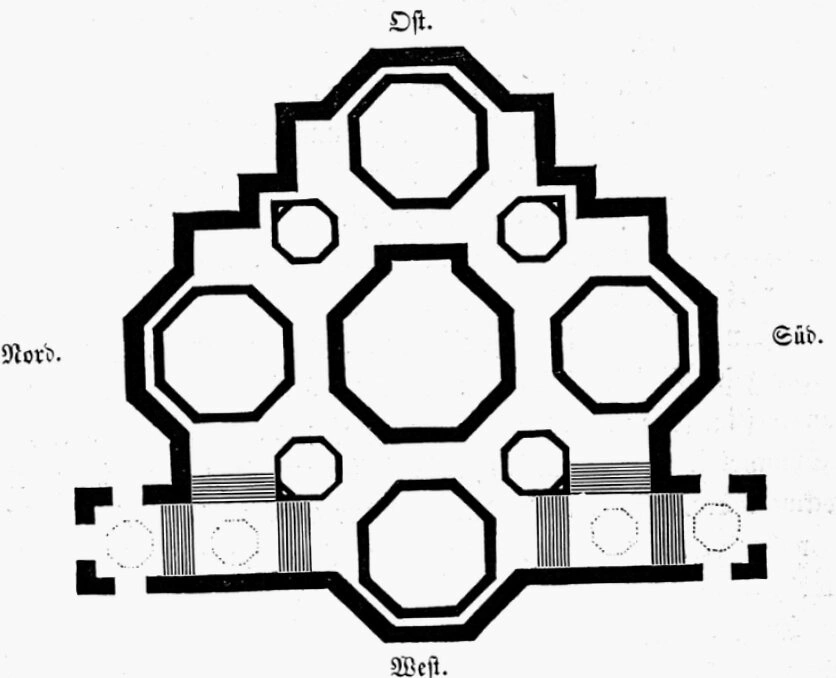 Представленный чертеж являет собой исторический план этажа величайшей святыни православной Руси — Собора Покрова Пресвятой Богородицы, что на Рву, в народе более известного как храм Василия Блаженного. Сей архитектурный документ, созданный с немецкой точностью и обозначенный сторонами света (Ost — восток, Süd — юг, West — запад, Nord — север), открывает взору исследователя сакральную геометрию храмового ансамбля, воздвигнутого в царствование благоверного царя Иоанна IV Грозного в честь покорения Казанского ханства.