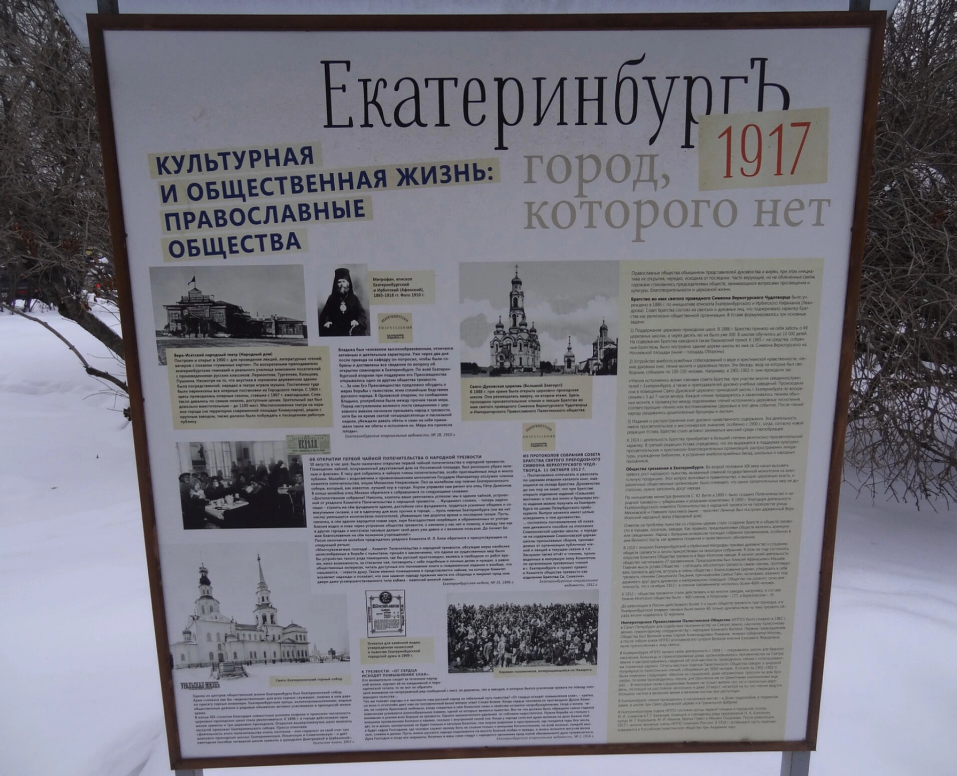 На представленной фотографии запечатлен информационный стенд, посвященный истории православного Екатеринбурга. Стенд содержит ценные исторические материалы о духовной жизни города до революции 1917 года.
