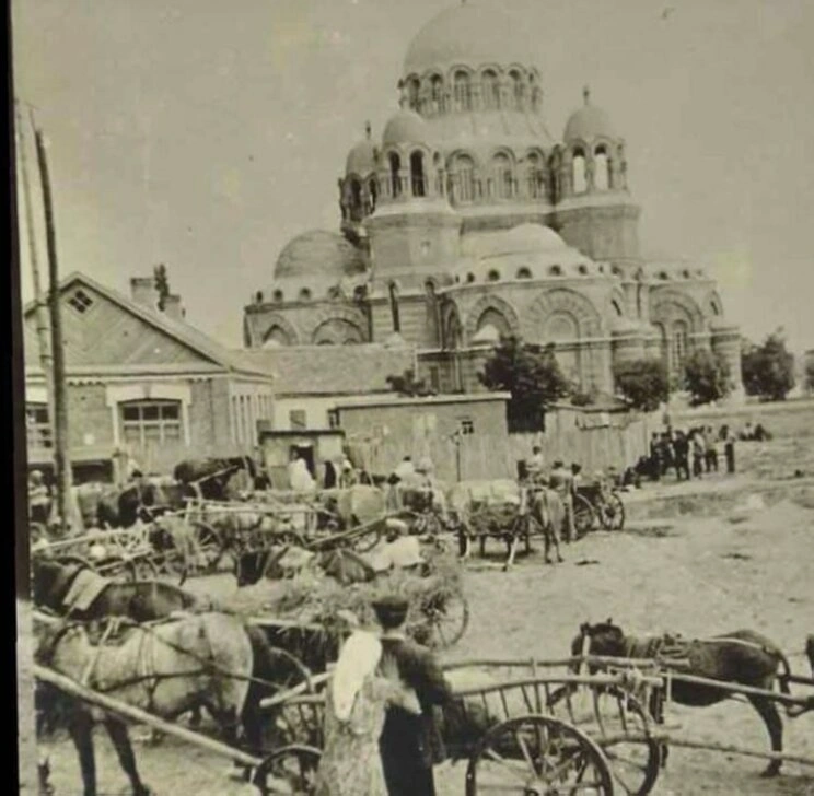 На представленной исторической фотографии запечатлён вид на оживлённую базарную площадь города Хасавюрта, сделанный, предположительно, на рубеже XIX–XX столетий. Доминантой снимка и духовным центром города является величественный Знаменский собор, освящённый в честь иконы Пресвятой Богородицы «Знамение». Его монументальный объём с главным куполом, увенчанным православным крестом, возвышается над городской застройкой, символизируя незыблемость веры.